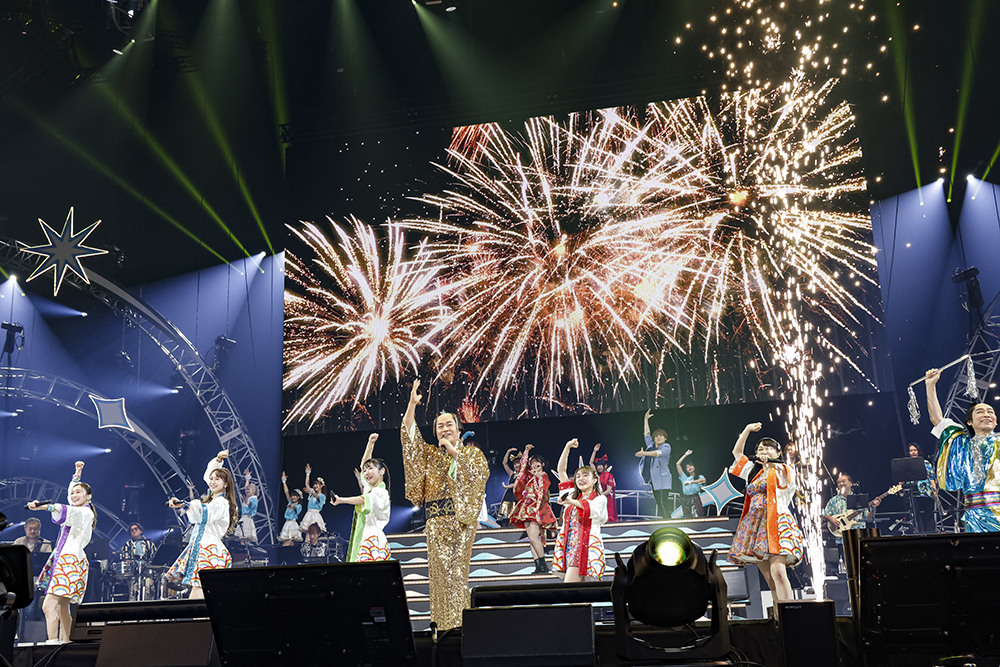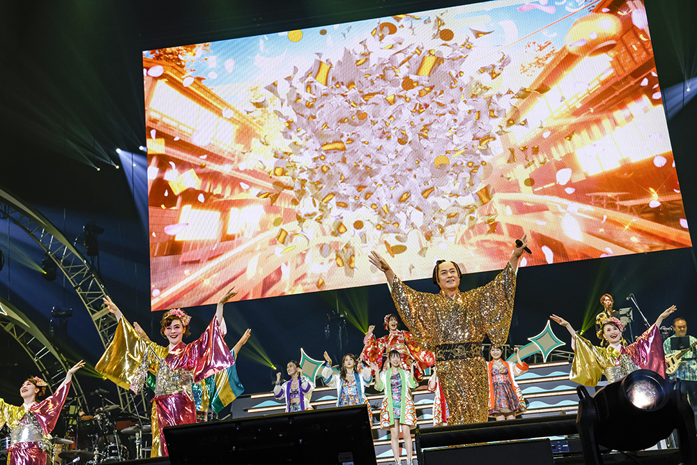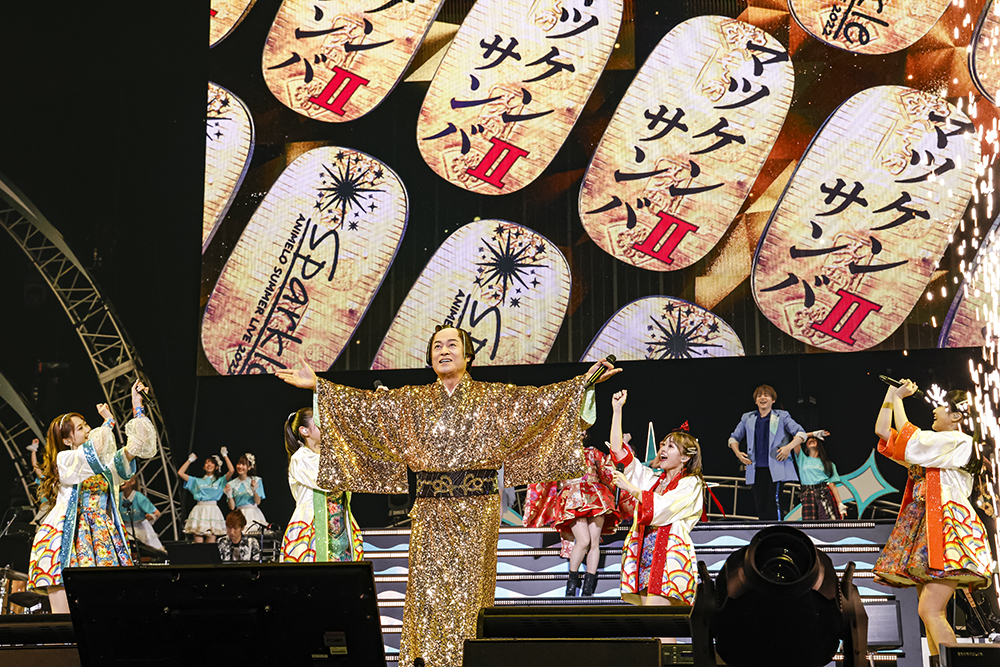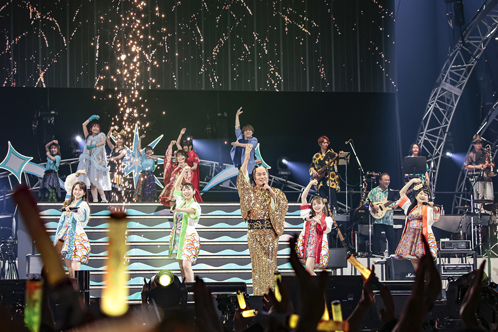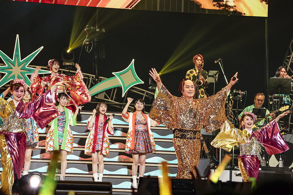 陽気なサンバのメロディと共にステージには腰元ダンサーズが現れ、i☆Risとまあや姫、さらに他の出演陣も合流。そして煌びやかな黄金の衣装に身を包んだ松平健が登場して「マツケンサンバⅡ(Summer Sparkle ver.)」がスタート。サビの部分の合いの手ではアニサマアーティスト陣も声を合わせたり、感想ではアニサマバンドの演奏も加わるなど、アニサマと松平健の見事なコラボレーションに会場内は大きな喜びと驚きに包まれながら、前半戦を大団円で締めくくった。
