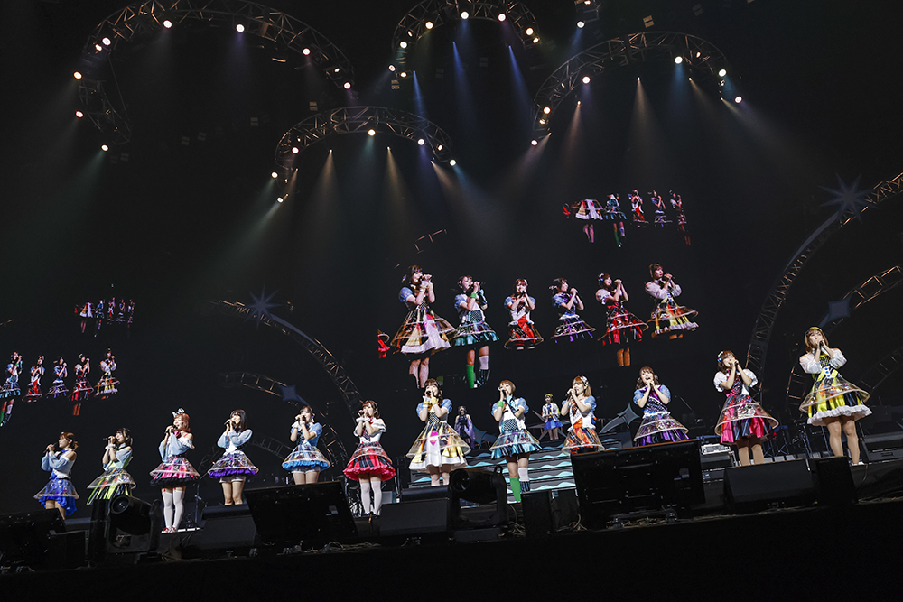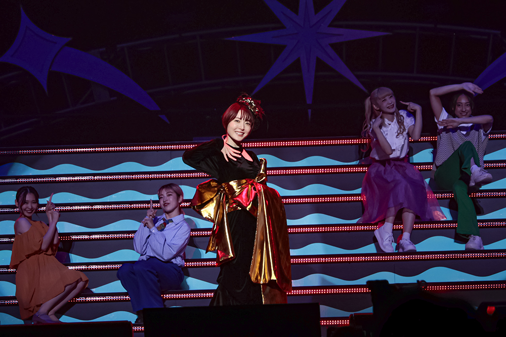 そんなテンションをさらに押し上げるように、スクリーンにはTVアニメ『パリピ孔明』のオープニングアニメが映し出され、ステージにはダンスユニットPROPSが登場してパフォーマンスに加わる…三曲目は何とi☆Risによる同作オープニングテーマ「チキチキバンバン」のカバーというサプライズナンバーだ。ダンサーを交えてのキレのあるダンスはもちろん、5人それぞれがラップも決めてスーパーアリーナが巨大クラブと化すような盛り上がりを見せた。