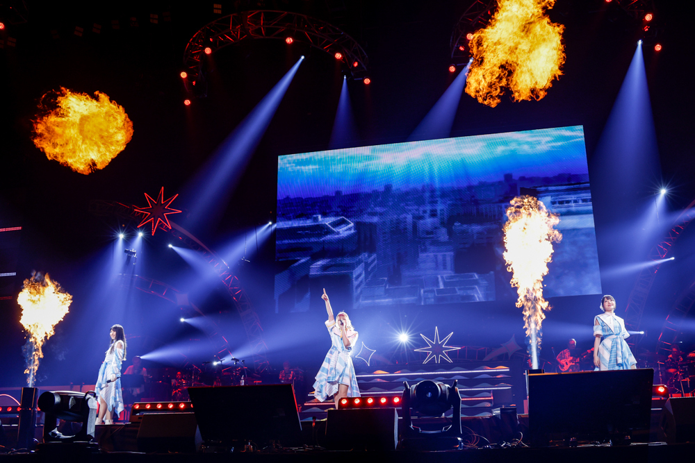一曲目はTVアニメ『ハイスクール・フリート』OPテーマ「High Free Spirits」。ノリの良さと迫力のハーモニーが光るTrySailの定番ナンバーとなった一曲を、三人は初っ端から全開の如きパワフルさで熱唱。間奏ではメンバーからの「アニサマー!」のかけ声に合わせて、ファンも拳とコンサートライトを突き上げて全力の応援を送った。