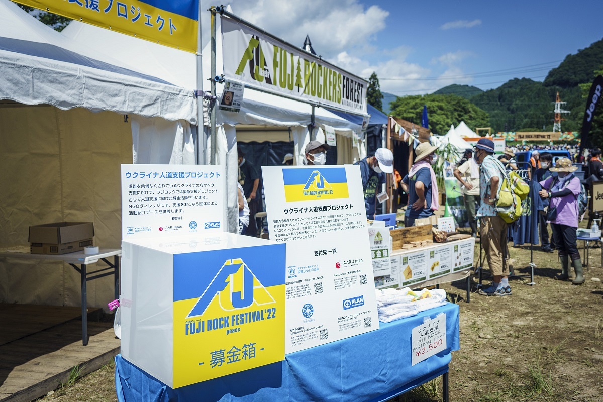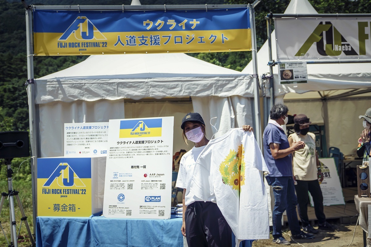 こうした『フジロック』の活動は今年に限ったものではない。これまで、2004年の新潟県中越地震、2007年の新潟県中越沖地震、2011年東日本大震災など、被災地支援のためにプロジェクトを立ち上げ、来場者と共にできる支援活動を継続してきた。また、今年の『フジロック』場内ではチャリティグッズの販売や募金活動以外にも、ウクライナの国旗を示すブルーとイエローから成るフラッグの掲示や、ウクライナに縁のある映画『ひまわり HDレストア版』を放映したほか、アトミック・カフェでは「戦争と平和」「反戦、平和、ウクライナ」をテーマに、アーティストや有識者らがトークライブを開催し、来場者一人ひとりが社会問題を考えるきっかけとなる場を広く提供していた。