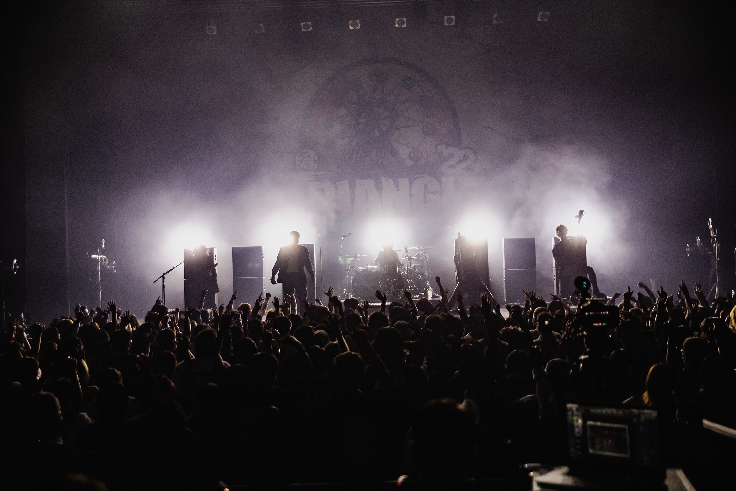 オープニング、爆音を浴びながらN∀OKI(Vo)「俺たちに全部委ねてくれ!」と叫び、テンション上がるギターリフから「金色グラフティー」でライブが始まると、一曲目からこのステージへの想いと覚悟が伝わる、渾身の歌と演奏で観客の心に迫ったROTTENGRAFFTY。観客も拳を突き上げ、クラップを合わせて、その想いに応える。「永遠と影」、「STAY REAL」と続き、激しさを増す演奏に、ギュンギュンと拍車をかけるN∀OKIとNOBUYA(Vo)のツインボーカル。「マナーとかルールとか、色々ややこしいけどさ。ここまで守ってくれてるみんな、ほんまめっちゃカッコいいわ! 「めちゃくちゃヘッドバンキングすること」はルールで許されてますよね!?」とNOBUYAが挑発し、N∀OKIが腕をぶん回して始まった「This World」は、ヘドバンで波打つフロアの観客と攻めまくった歌と演奏のバチバチのぶつかり合いに火花が散る。MCでは「4年ぶりに『TRIANGLE』に帰ってきました。去年も一昨年も色々ありましょうが、最終的には継続することが一番やと思ってます。貫いてあの場所を取り戻しましょう!」と告げたN∀OKI。「ロック好き、ライブ好き、そしてPROJECT FAMIRYに心から捧げます」と、たっぷり気持ちを込めて届けた「Familiarize」に全員が手を振り合わせて始まった後半戦は、四つ打ちの「D.A.N.C.E」で踊り狂って、混乱混迷の世界をここからブチアゲていこうという願いと希望を込めた「ハレルヤ」で熱く激しくフィニッシュ。そう、どんなにシンドく苦しくても、俺たちにはライブハウスがあるし、ROTTENGRAFFTYがいるのだ。