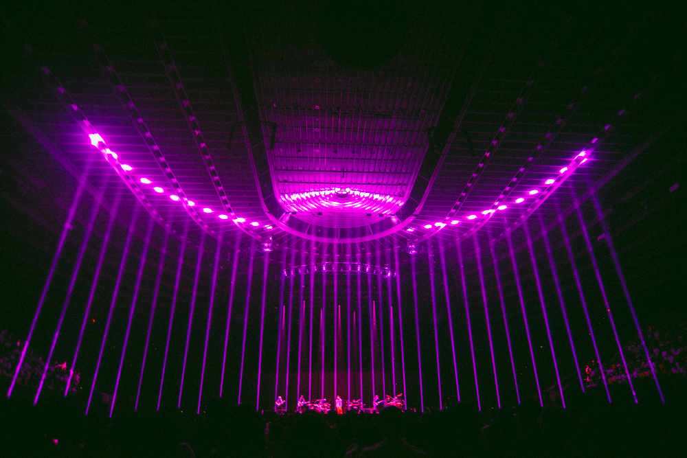 今回のツアー中に発表された最新シングル「初恋が泣いている」を披露すると、ここからは映像演出を使用。円形の枠内にメンバーが映し出された「ユラユラ」に続いては、ドラムとパーカッションのスリリングなセッションから「鯉」に突入して、カラフルな映像がアッパーな曲調をさらに盛り上げる。艶っぽいアカペラから始まった横ノリの「スーパーガール」は、モノクロの映像がアダルトでムーディーな雰囲気を強調し、サイケデリックな間奏も強烈。「愛を伝えたいだとか」ではステージの両サイドに伸びた花道を使い、オーディエンスとより近い距離で熱量の高いパフォーマンスを繰り広げ、前半戦のピークが刻まれた。