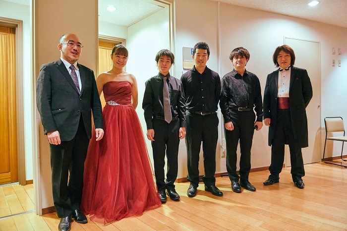 指揮の飯森範親(右)とコンサートマスタの戸澤哲夫(左)とファイナリストたち。