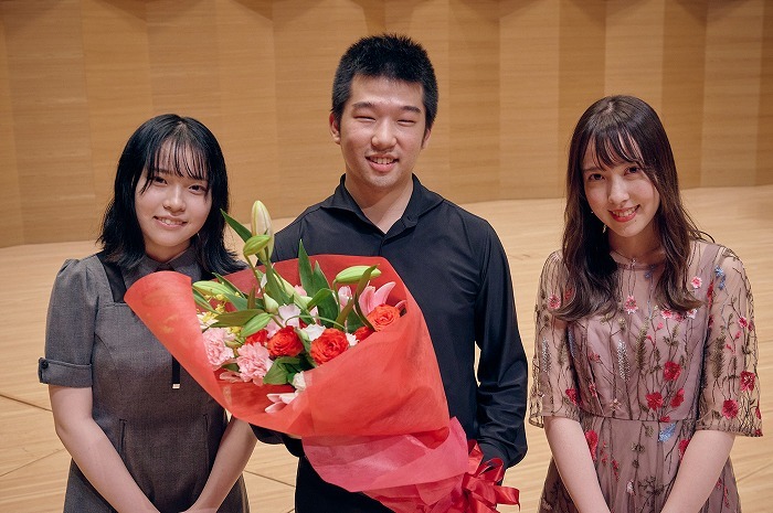 北村明日人(中央)と、歴代グランプリの野村友里愛(2021・左)、尾城杏奈(2020・右)。