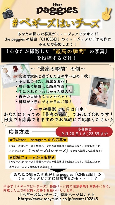 「#ペギーズはいチーズ」はファンが撮影した「最高の瞬間」をテーマにした写真を募集し、応募された写真が新曲「CHEESE!」のミュージックビデオに登場するという、バンドとファンを繋ぐ新企画となっている。