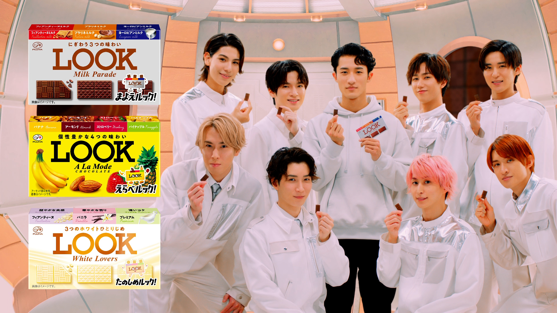 『不二家LOOK まよえる!えらべる!たのしめルック!新商品』篇は、店頭へやってきた岩本が、棚に並ぶ3つの「ルック」の中から、新商品「ルック(ミルクパレード)」を選び、手に取るまでの一瞬の葛藤を、岩本の脳内にいるSnow Manのメンバーたちが大騒ぎをしながら導いていく様子に例え、「ルック」の選べる楽しさを表現。