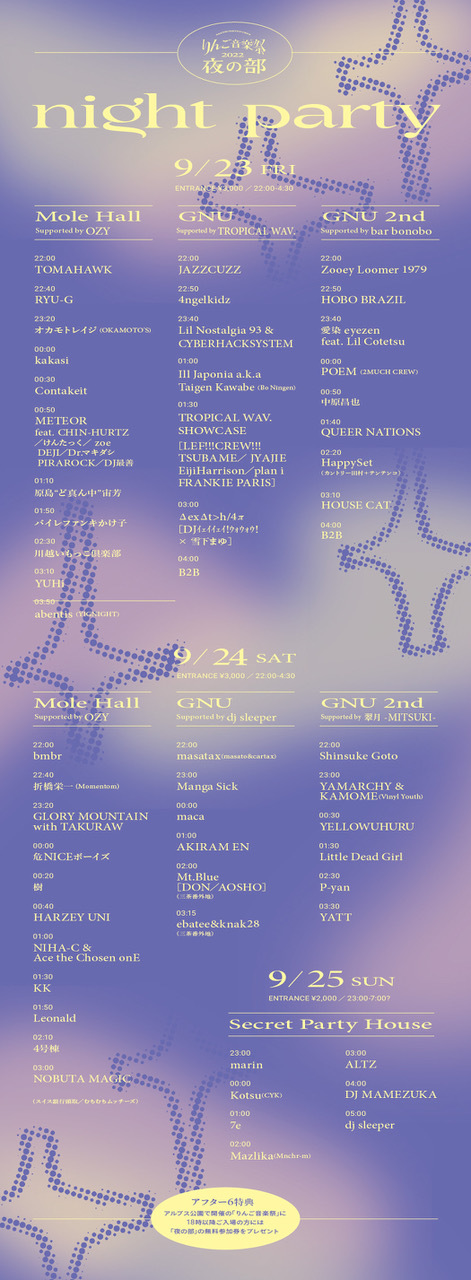 『りんご音楽祭2022夜の部』は、りんご音楽祭の会期中、松本の夜の街を賑わすアフターパーティー。『りんご音楽祭2022』出演アーティストを中心に、個性豊かなアーティストたちが松本の夜を盛り上げる。アフター6特典としてアルプス公園で開催の『りんご音楽祭2022』に18時以降入場した人には「夜の部」の無料参加券をプレゼントすることも決定した。