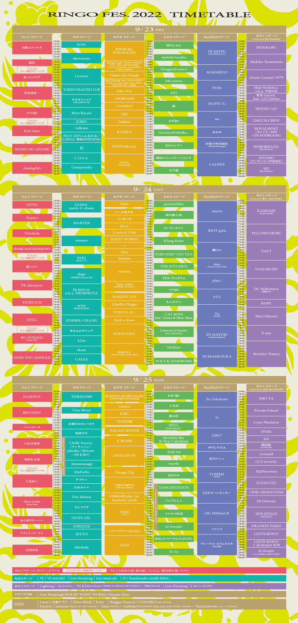 そして、全6ステージと夜の部のタイムテーブルが公開された。14年目となる今年の『りんご音楽祭』は、ステージを6つに増やし、9月23日からの3日間、規模を戻しての開催に。出演アーティストは総勢265組となった。