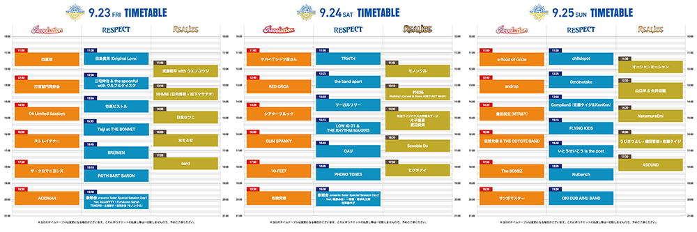 各日の新たな顔ぶれは、23日(金・祝)に三宅伸治 & the spoonful with ウルフルケイスケ、 TAIJI at THE BONNET、象眠舎 presents Solar Special Session Day1 feat. AAAMYYY・Furukawa Sarah・TENDRE・土岐麻子・吉田沙良(モノンクル)、武藤昭平 with ウエノコウジ、 HHMM (日向秀和×松下マサナオ)、 bird。24日(土)にthe band apart、TRI4TH、東北ライブハウス大作戦ステージ 片平里菜 渡辺俊美、象眠舎 presents Solar Special Session Day2 feat. 福原みほ・一青窈・奇妙礼太郎・吉澤嘉代子、ヒグチアイ、 モノンクル、 Scoobie Do。25(日)にはComplianS(佐藤タイジ & KenKen)、 FLYING KIDS、ASOUND、うじきつよし × 織田哲郎 × 佐藤タイジ、オーシャンオーシャン、山口洋 & 矢井田瞳となっている。