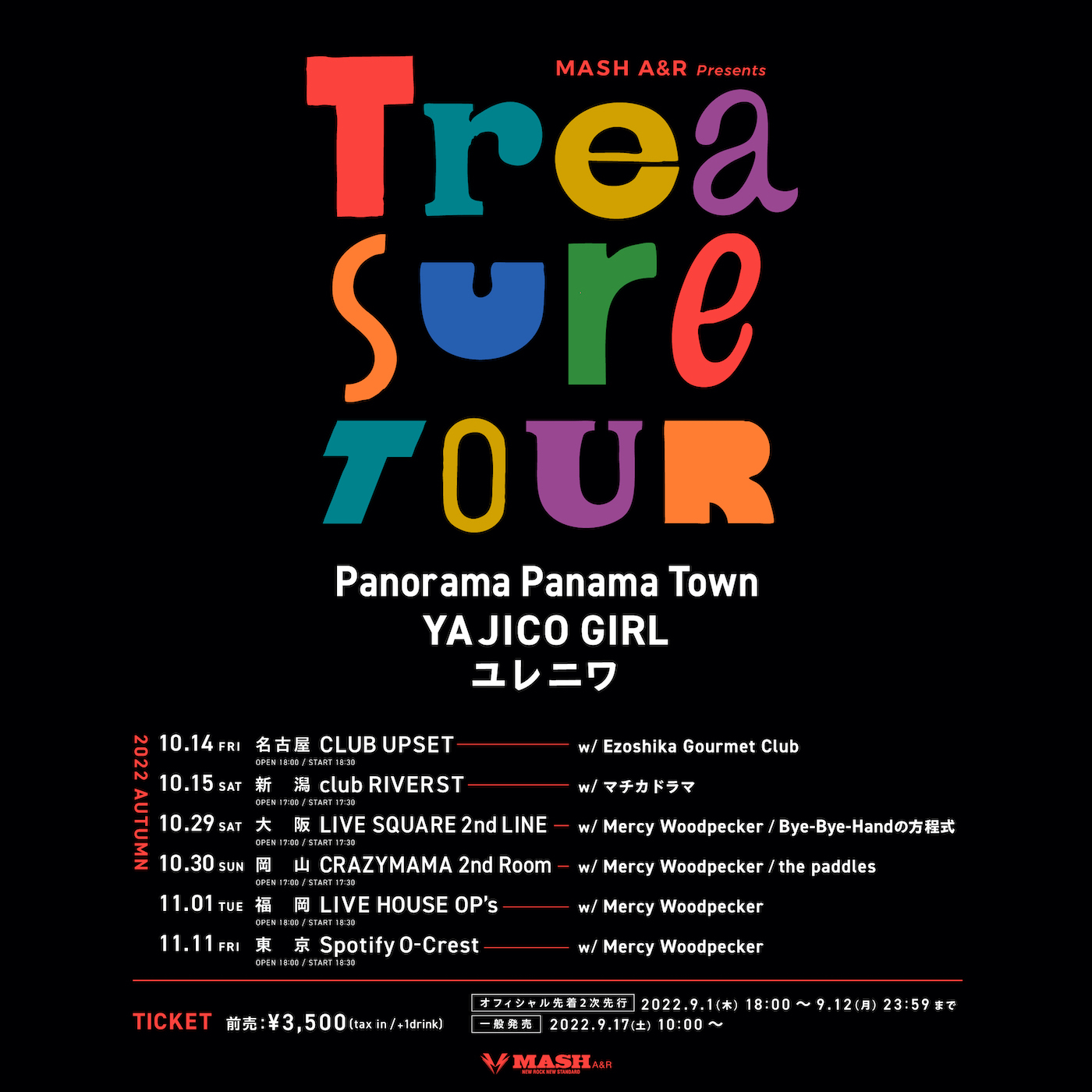 MASH A&R所属のPanorama Panama Town、YAJICO GIRL、ユレニワの3組と、追加出演者としてMercy Woodpeckerの出演が既に決定している、MASH A&R主催イベント『MASH A&R presents「Treasure Tour」』の全出演者が解禁された。