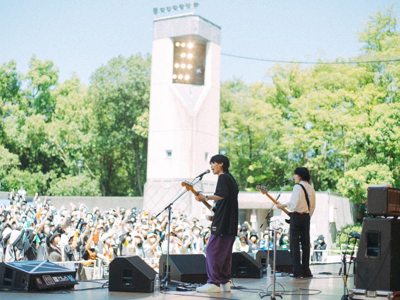 まずはRe:name、大阪発の3人組ポップロックバンドだ。「Re:nameはじめます、よろしく」と、1曲目「Future There」からうだる暑さを清々しい気分に換え、爽やかなギターロックを鳴らしていく。高木一成(Ba.Vo)のベースはオーディエンスのテンションをぐぐっと持ち上げ、Soma(Gt.Cho)のギターがそれをハイなままキープする。洋楽を良いとこどりしたキャッチーなメロディセンスは一聴するだけで聴く人をご機嫌にしてしまう。「20周年を祝いに来ました! 誰よりも熱いフロアに!」と、次曲「Swingboat」では歌詞をアレンジしてセカンドライン愛をたっぷりアピール。アコギ×洋楽ギターロックの爽やかなメロがうだる暑さを和らげてくれる。
