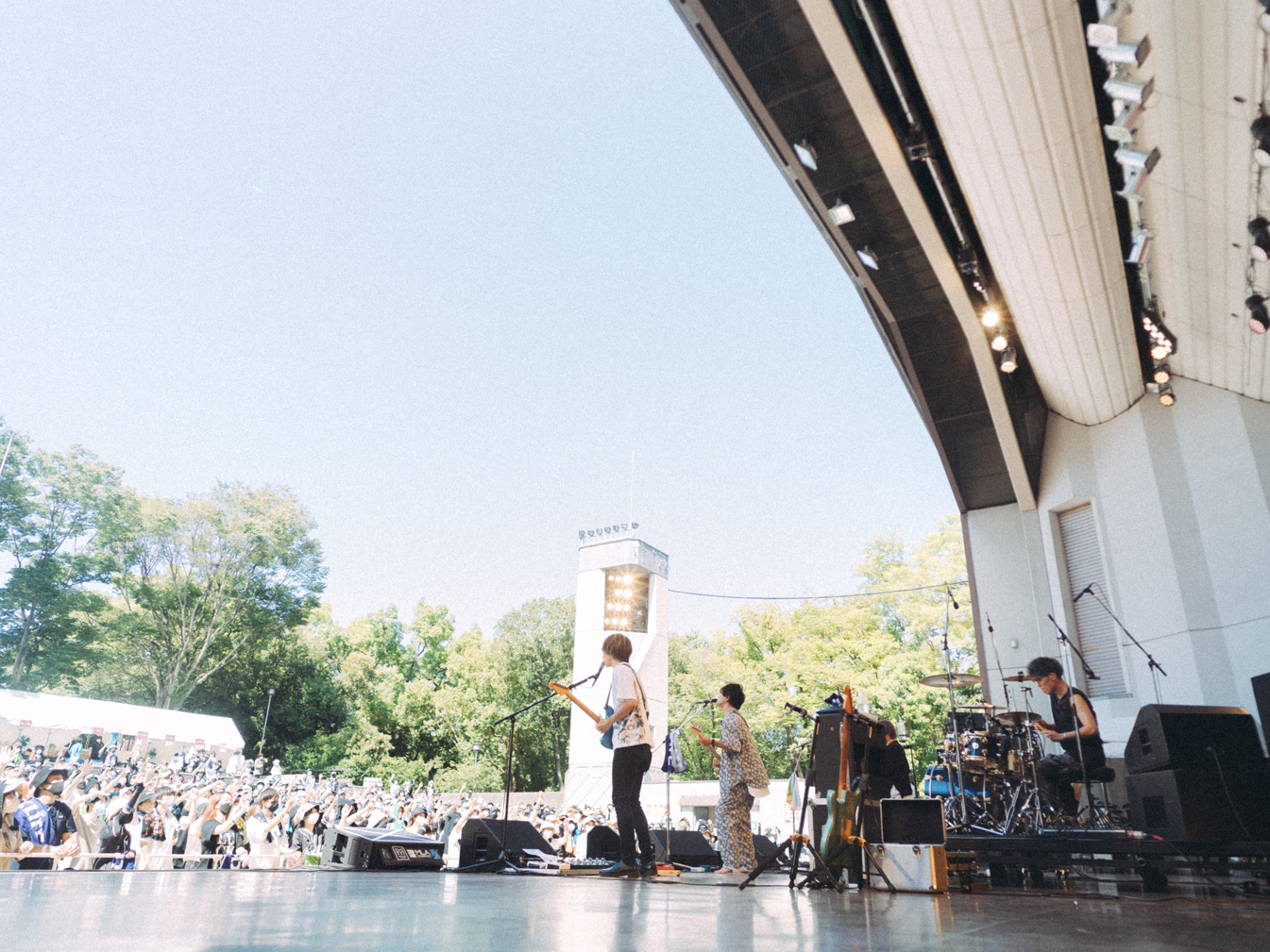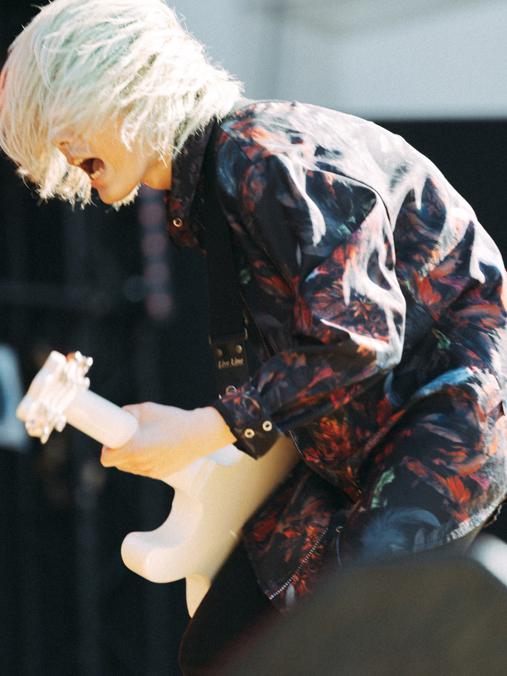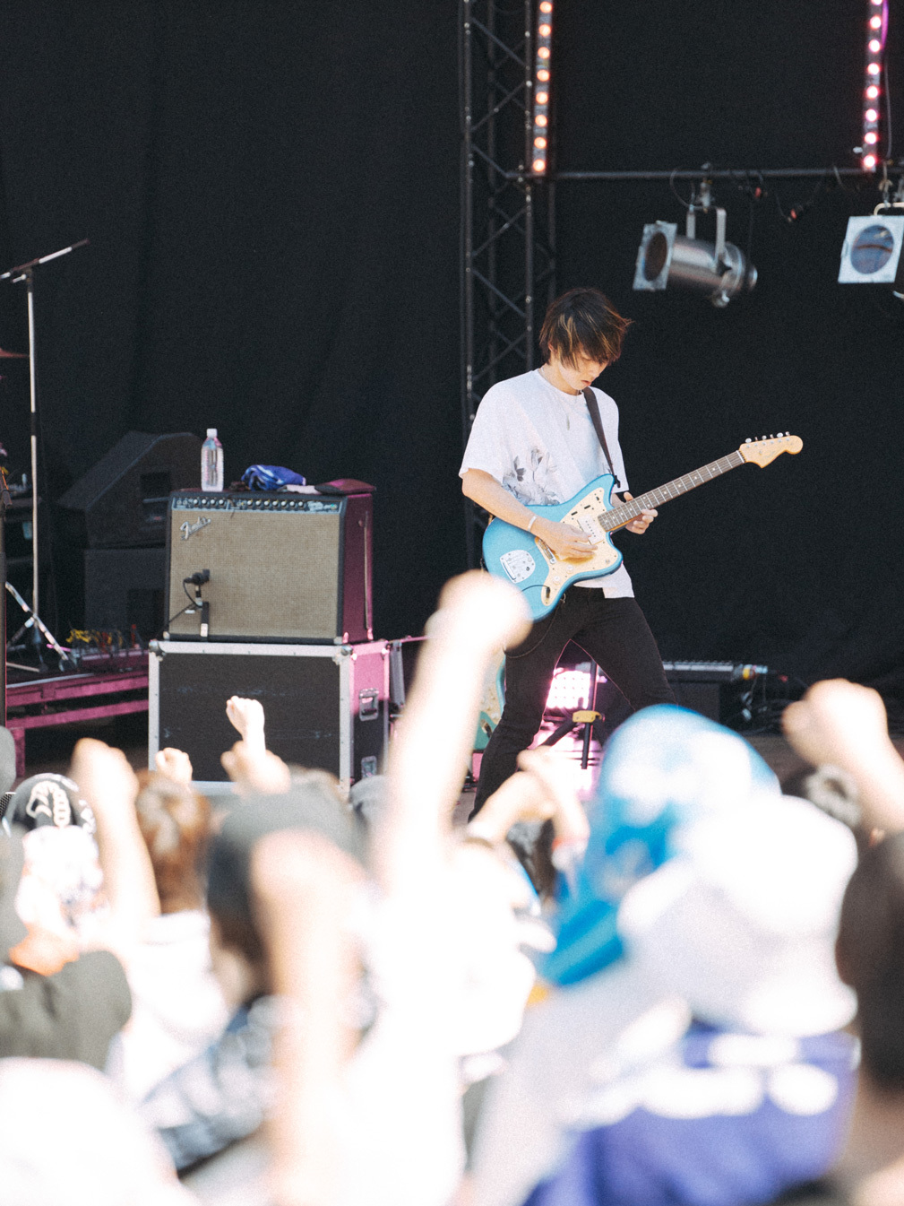 「ここは大好きなライブハウス、セカンドラインの気持ちで!」と、野外の会場をライブハウスに換えてしまおうと、「Ugly」「Letter」でモダンだったり儚さや憂いを表現したりと、これでもかとバンドの魅力を存分に伝えていく4人。「White」では美しい旋律に乗せピュアな恋心を歌えば、会場からは自然と拍手が沸き起こる。ライブハウスで大好きな曲を聴いた時の堪らなく嬉しいあの気持ち、この日は野外の高い空の下でちゃんとそれを受け取れている。