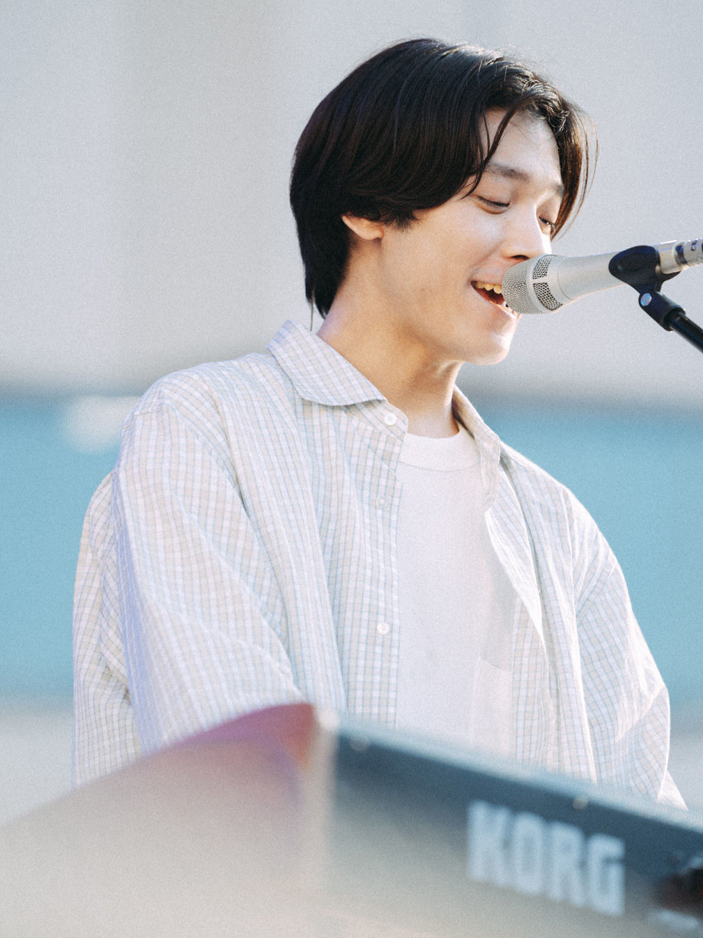 西日がまだまだ体温を高めるなか、SHE’Sは1曲目「追い風」からタイトルのままに観客のテンションをさらに押し上げていく。ポップなメロに清涼感のある井上竜馬(Vo.Key)の歌声、楽曲後半には服部栞汰(Gt)のギターが走り抜け、よりドラマチックな楽曲へと仕立て上げていく。アコギメインでラテンな雰囲気がぐっと大人の香りを漂わす「Masquerade」、広瀬臣吾(Ba)、木村雅人(Dr)のリズムアレンジも秀逸で、全身で音に塗れていくのが心地よくて仕方ないし、井上の歌声も前曲とがらりと変わり、色香たっぷりだ。