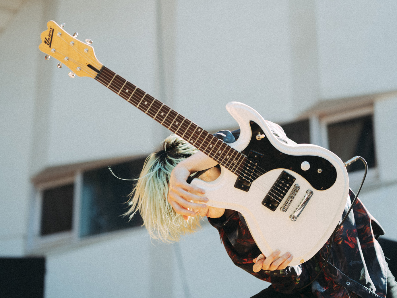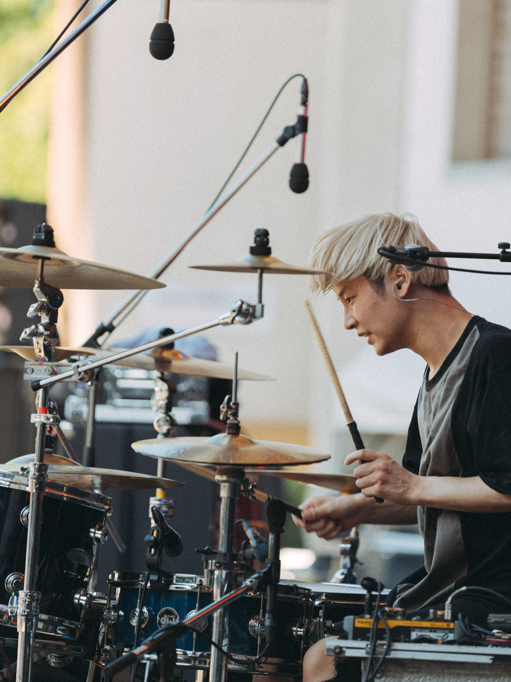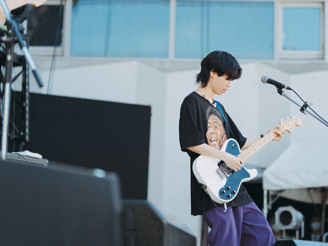 炎天下の野外に蝉がうるさく鳴き騒ぐなか、ハイテンションで前説に登場したのは「ふみやん」こと、セカンドライン4代目店長の前田典昭だ。セカンドラインに懸ける思いを語りつつ(https://spice.eplus.jp/articles/305400)、「毎日電車の音を聴いて、バンドとお客さんと出会い、1公演1公演を大切に、バンドの音を伝えてきたから今日みたいな日が作れた。今日はここがセカンドライン!」と、セカンドライン名物の電車の音が鳴るなか、開幕を宣言。バンドポスターが貼りつくされた細い廊下も、コンクリートで囲まれたステージや柱もないけれど、この野外の開放的な空間が「セカンドライン」のステージに。そしてここから、セカンドラインの血筋を引いた5組の饗宴が始まった。