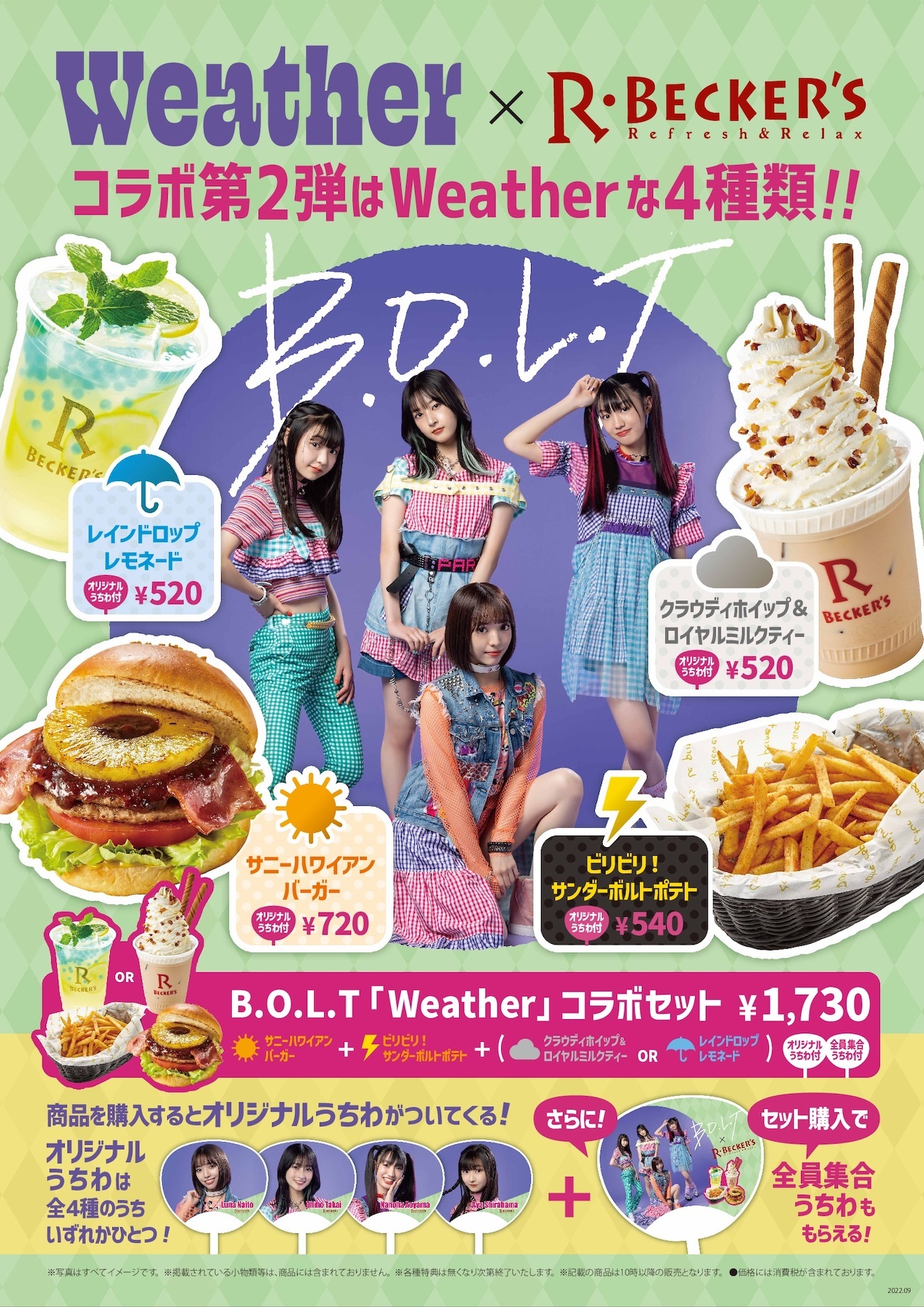 期間中は、B.O.L.T 1st EP『Weather』(2022年8月10日(水)リリース)にちなんで、晴れや雨などの天気をイメージした5種類のコラボメニューを販売。また、購入した人には「Weatherコラボ オリジナルうちわ」がプレゼントされる。