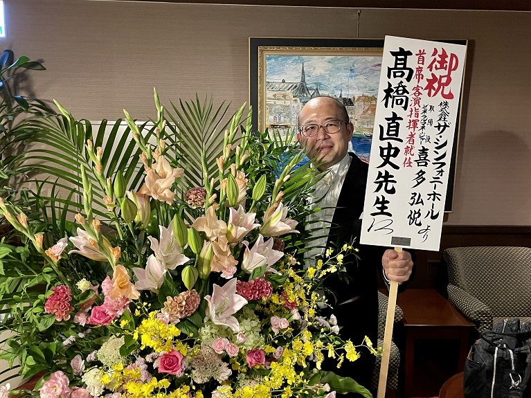 首席客演指揮者就任の定期演奏会で贈られた花に囲まれて 写真提供:大阪交響楽団