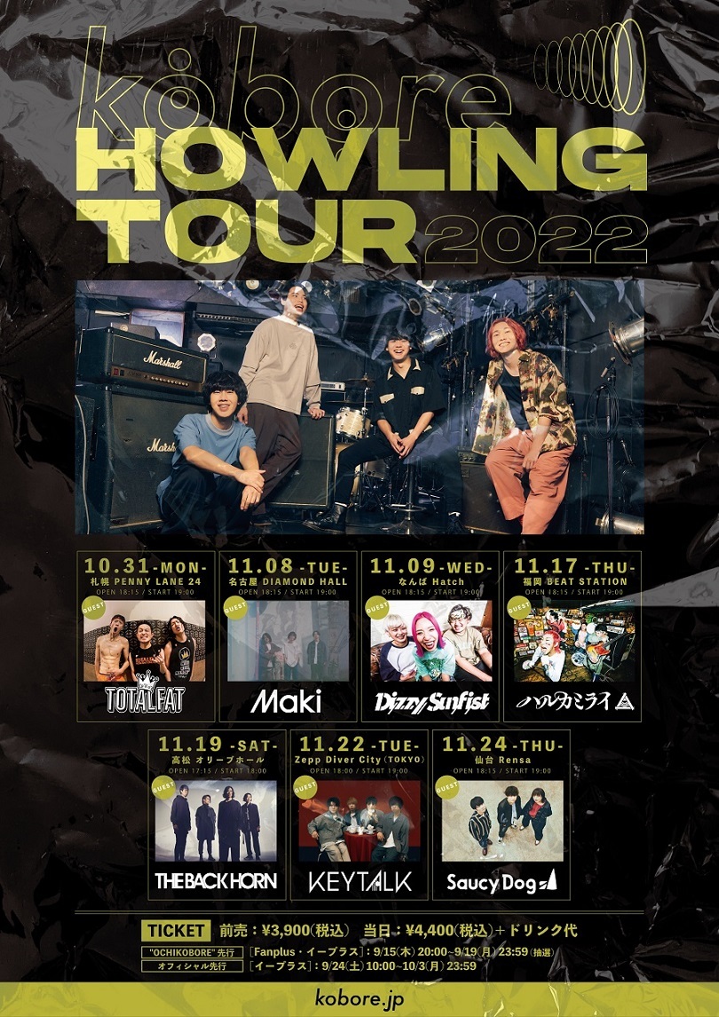 東京 府中発ギターロックバンド・koboreが、10月31日札幌を皮切りに全国7箇所をまわる対バンツアー 『kobore「HOWLING TOUR 2022」』のゲストバンドを発表した。