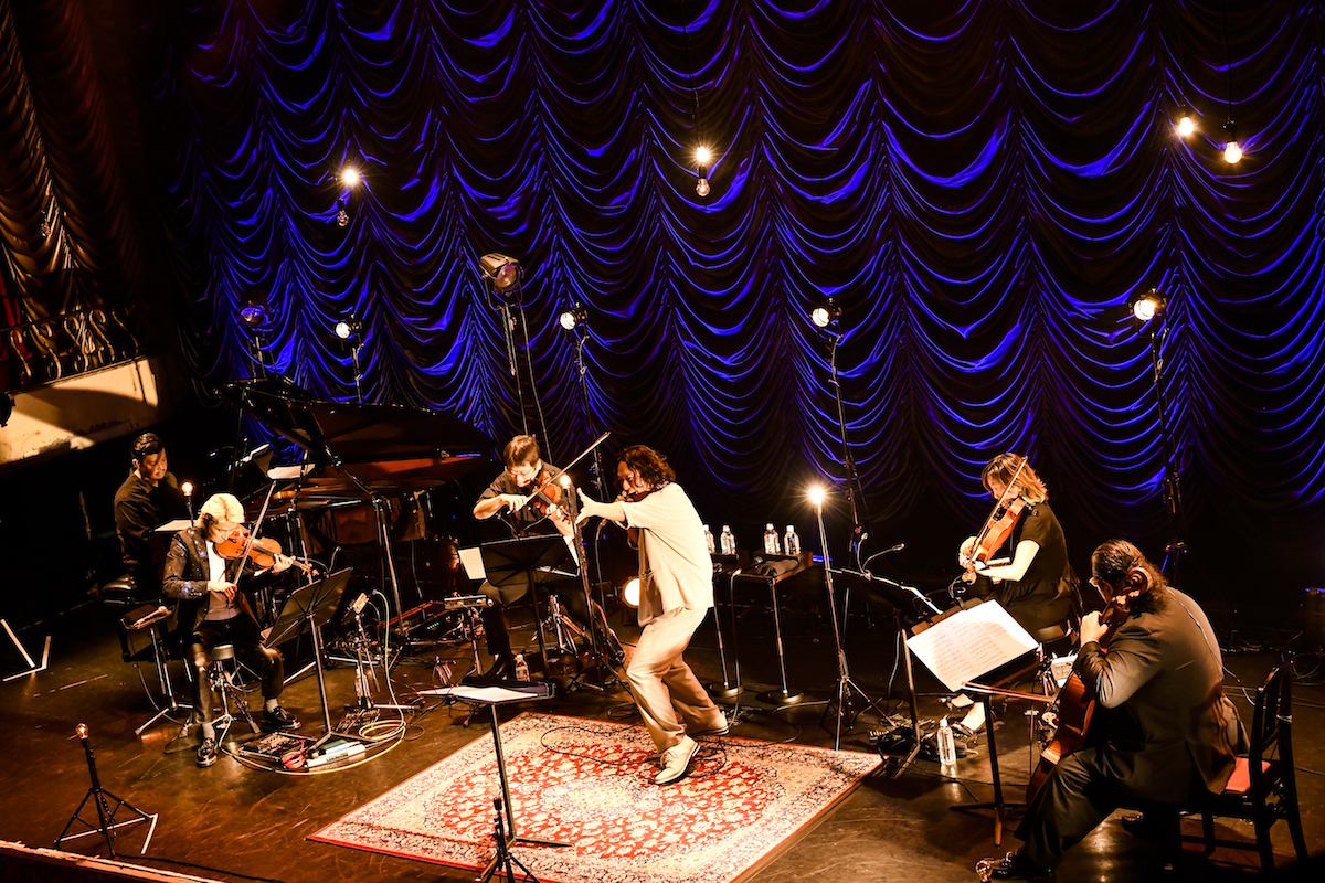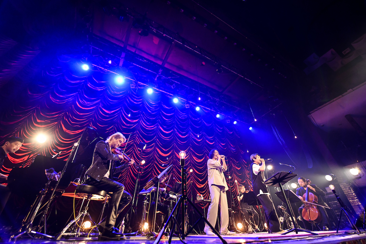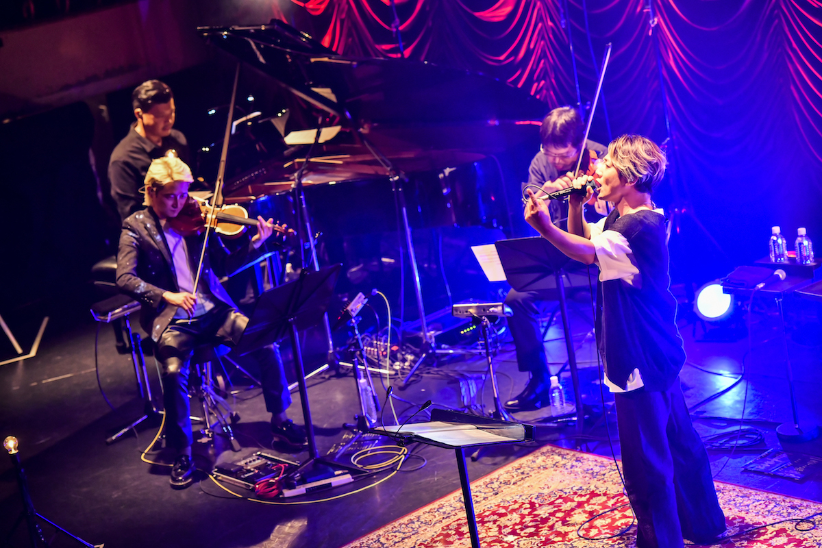 かつてはキャバレーだったというレトロかつラグジュアリーで、どこか怪しげな空間。ステージ背後で細かなヒダが陰影を映すカーテン、床に貼られた柄物の絨毯など、もう雰囲気はバッチリ合っている。定刻になるとまずNAOTO QUARTETの面々が登場し、「Stay With Me」が始まった。インスト曲ながら、NAOTOの弾く主旋律はどこまでもメロディアスで、広大なサウンドスケープの中にどこかセンチメンタルな響きを含んだもの。次第に厚みを増していくストリングスのアンサンブルに、呉服隆一のピアノがそっと寄り添う。東京キネマ倶楽部って音も良いんだな、といきなり気づかされる。