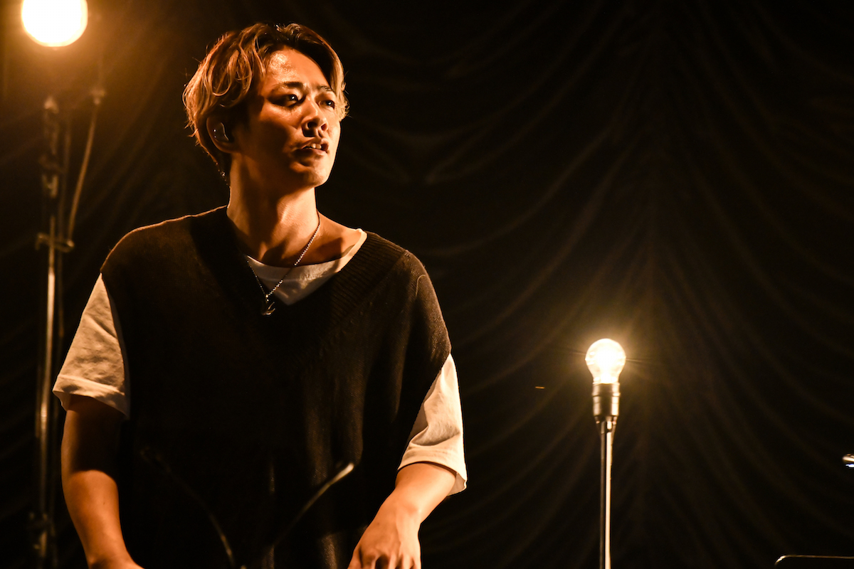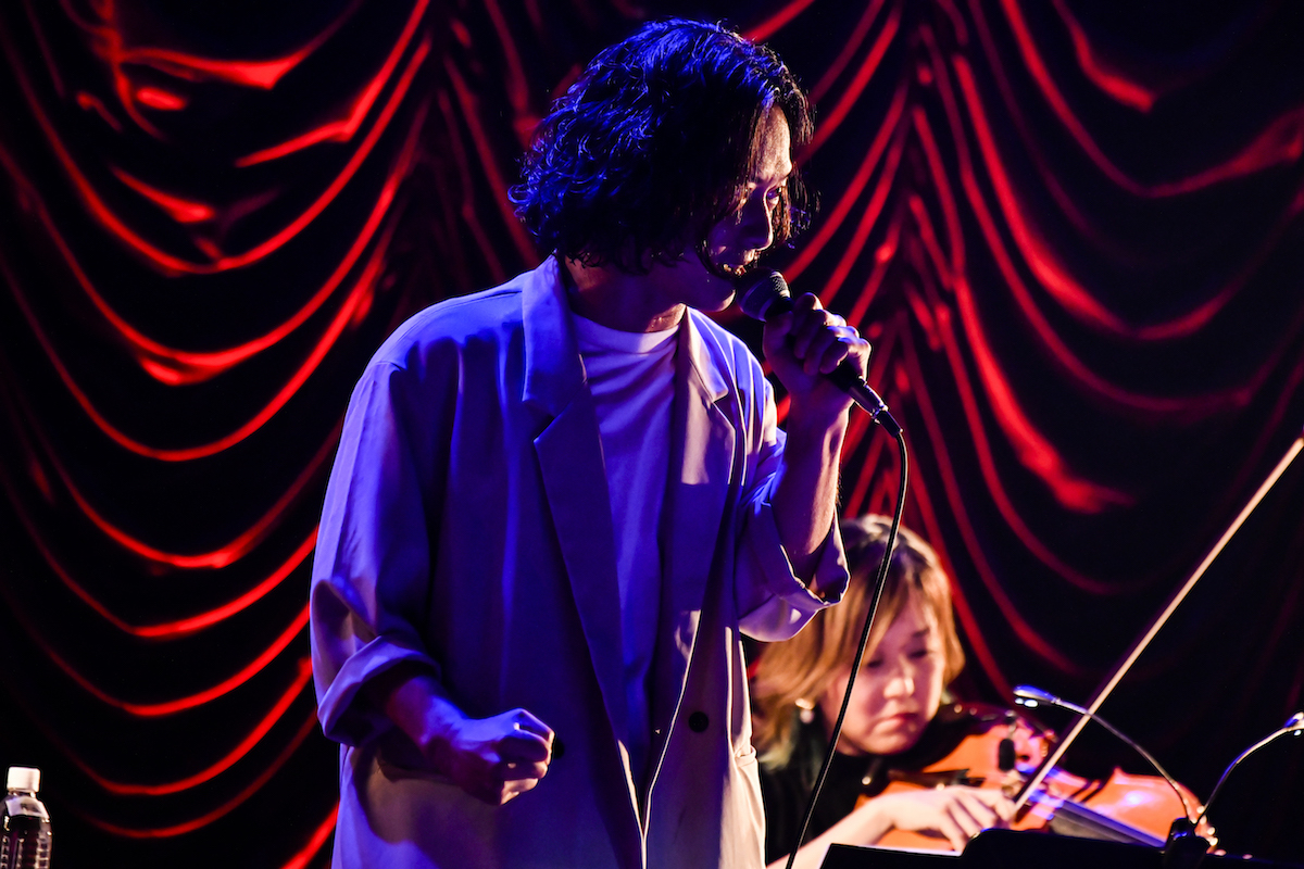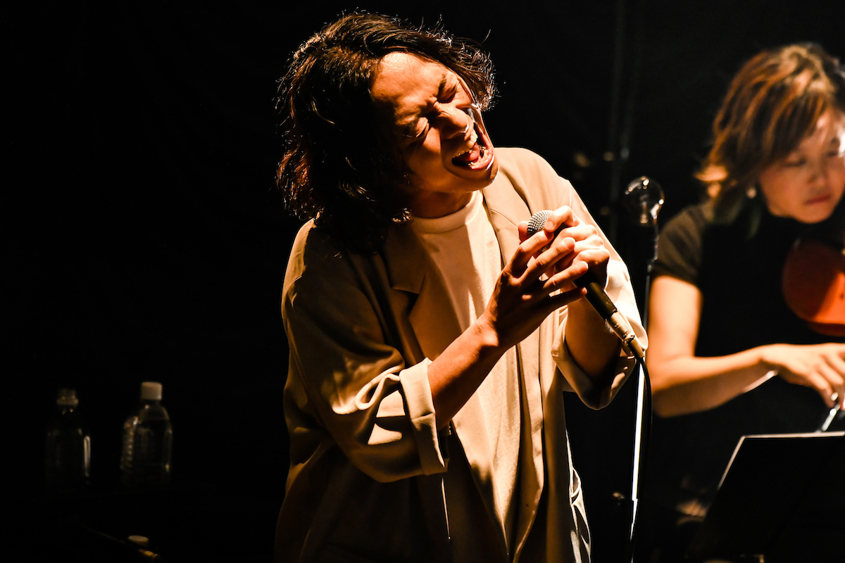 妖しくエロティックな歌い出しもタンゴ調にアレンジされた弦楽器の調べも、絶妙にキネマ倶楽部という場にマッチしていたのは「罠」。ポエトリーリーディングのような始まりに息を呑まされ、次第に激情が迸っていく「月光」、それまでの展開とは一転して穏やかにあたたかに歌い上げたバラード「With You」──。ステージのど真ん中で見せる山田の立ち振る舞いは、時にコンテンポラリーダンサーのようであり、時に一人芝居を観ているかのようでもある。それらを決して大仰ではなく圧倒的にリアルなものとして表現する様は、まさに無二のシンガーと呼ぶに相応しい。