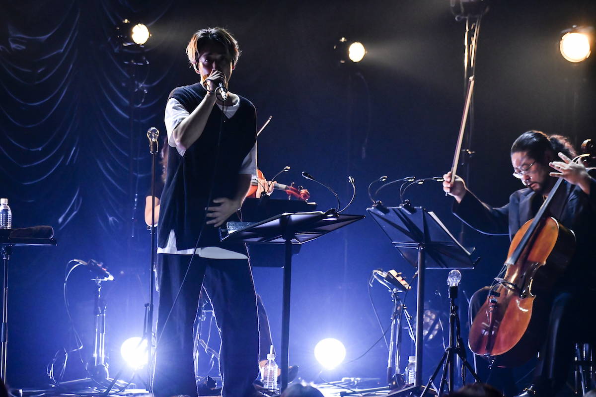 ここからは山田のターン。紅く染まったステージ上、先ほどまでとは一転してスリリングでエッジーな音で奏で出したのは、押しも押されぬキラーチューン「コバルトブルー」だ。いきなりスロットルをぶん回すかのようなスタートを切ったあとは、メロディアスな歌と演奏が琴線に触れる「冬のミルク」へと繋ぐ。世に出て20年以上経つ楽曲だが、曲と歌声に宿るメランコリーとリアリティは少しも褪せることがない。険しい面持ちで四重奏による演奏と、フロアの観客と、そして自己と対時するように、一曲一曲に精魂を込める山田の歌声は鬼気迫るものがある。