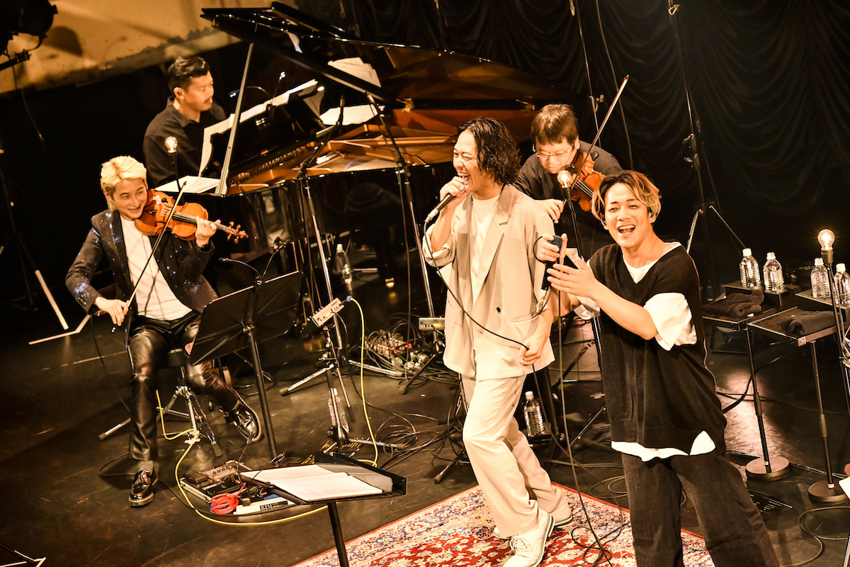 演奏を終え、ステージを去った7人に注がれた拍手がやがてアンコールを求める手拍子へと変わると、ほどなくしてカルテットの面々が戻ってきた。華やかで軽やかな「Dream in the Dark」のイントロに乗って、2人のボーカリストはステージ下手(しもて)のテラスから笑顔で登場。やわらかな表情からは達成感や安堵が窺え、場内もクラップで演奏を後押ししてピースフルな空気が充満していく。NAOTOの派手なソロも見事だ。そしてTHE BACK HORNの「ネバーエンディングストーリー」で、陽気にリズミカルにライブパートを終えた後は、スペシャルチケットを購入した観客に向けたアフタートークショー(ほぼMCが無かった本編と打って変わり、ここでは書きようのないユルーい時間でした)までやりきり、『ROCKIN’ QUARTET SPECIAL 2022』は終了した。