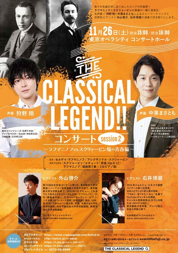 ――声優の狩野翔さん、中澤まさともさん、国際的にも活躍しているピアニスト外山啓介さん・石井琢磨さんという豪華な出演者が発表されていますが、『THE CLASSICAL LEGEND!!コンサート』session 2ラフマニノフvsスクリャービン焔の青春編、いったいどんなコンサートになるのでしょうか?