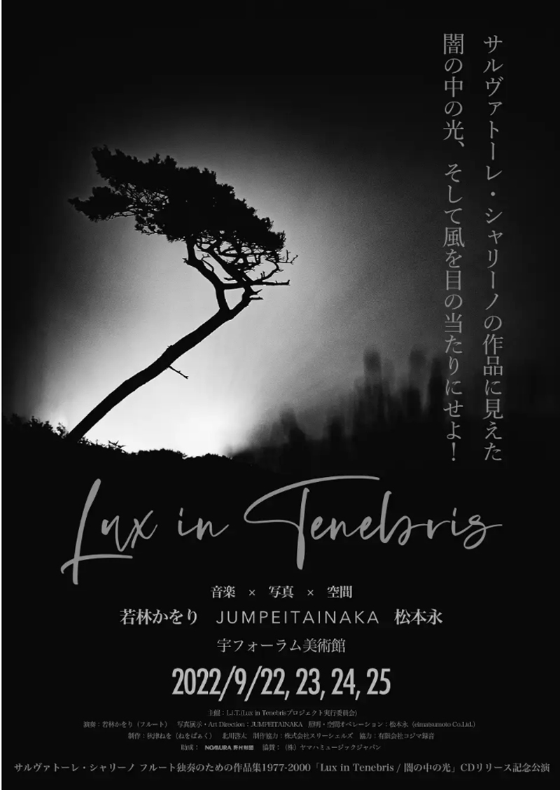 なお、今回、リリース記念公演と銘打ち、満を持して開催されるインスタレーション・コンサートでは、空間演出に松本 永を迎え、音楽・写真・空間を駆使して、より立体的に『Lux in Tenebris/闇の中の光』の作品世界の表現を目指す。フルートが奏でる音楽の中で浮かび上がる写真を、闇を纏った空間の中で描き出す。