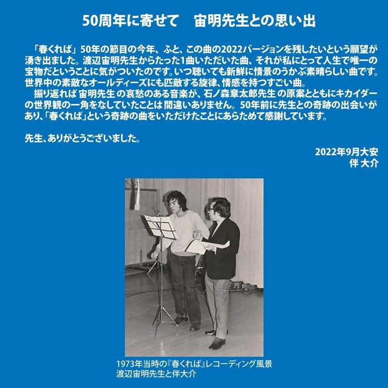 『人造人間キカイダー』の主演俳優・伴大介のデビュー50周年を記念したCD「春くれば2022」が、2022年10月14日に全国のCD店、ネットショップなどで発売される(企画・発売元:スリーシェルズ/ボロミアンリング)。同CDで伴大介が歌唱するナンバーは全曲、去る6月に他界したアニソン・特撮音楽の巨匠・渡辺宙明が作曲、その編曲・演奏をプログレッシヴ・ロックバンドの金属恵比須が担当した。伴大介のデビュー50周年はもちろん、渡辺宙明追悼の意も込めた、夢のコラボの実現が叶った。