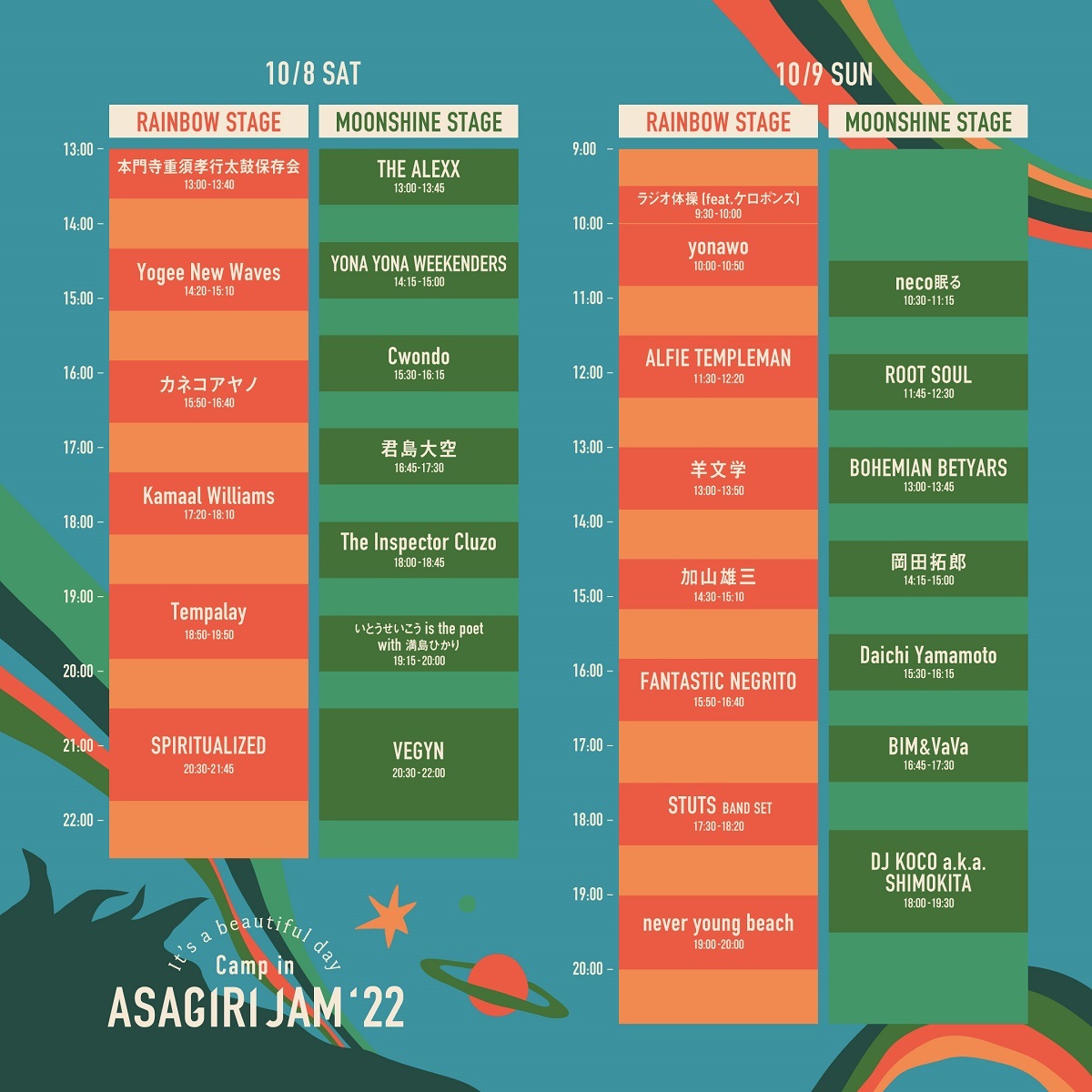 「RAINBOW STAGE」は初日がSPIRITUALIZED、2日目はnever young beachが、そして「MOONSHINE STAGE」は初日がVEGYN、2日目はDJ KOCO a.k.a. SHIMOKITAがトリを務める。RAINBOW STAGEとMOONSHINE STAGE、それぞれ特色を持つ2つのステージに、今年も幅広いジャンルのアーティストが出演する。最高のロケーションの中、2日間に渡り最高のパフォーマンスを繰り広げてくれることだろう。