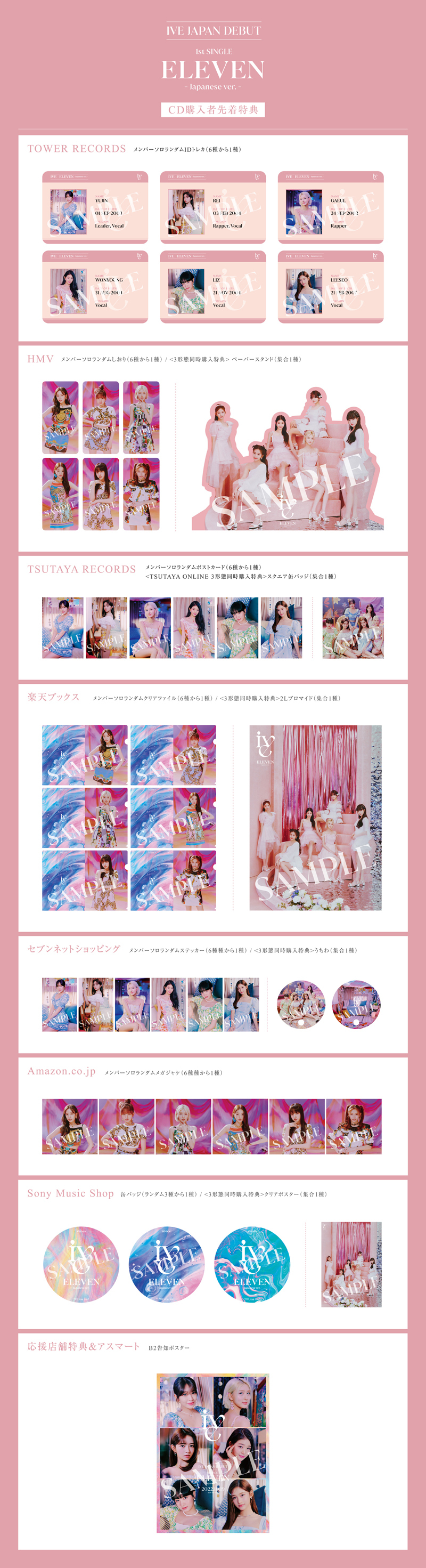また、9月23日に解禁となった日本デビューシングル「ELEVEN -Japanese ver.-」の店舗特典の絵柄は下記のとおり。9つのストアにて展開され、各メンバーソロの様々なアイテムから、シングルパッケージのマーブル模様が印象的なアイテムまで、3形態同時購入特典を含めると計13種類の多種多様なラインナップとなっている(各特典内容は、下記リリース情報を参照のこと)。
