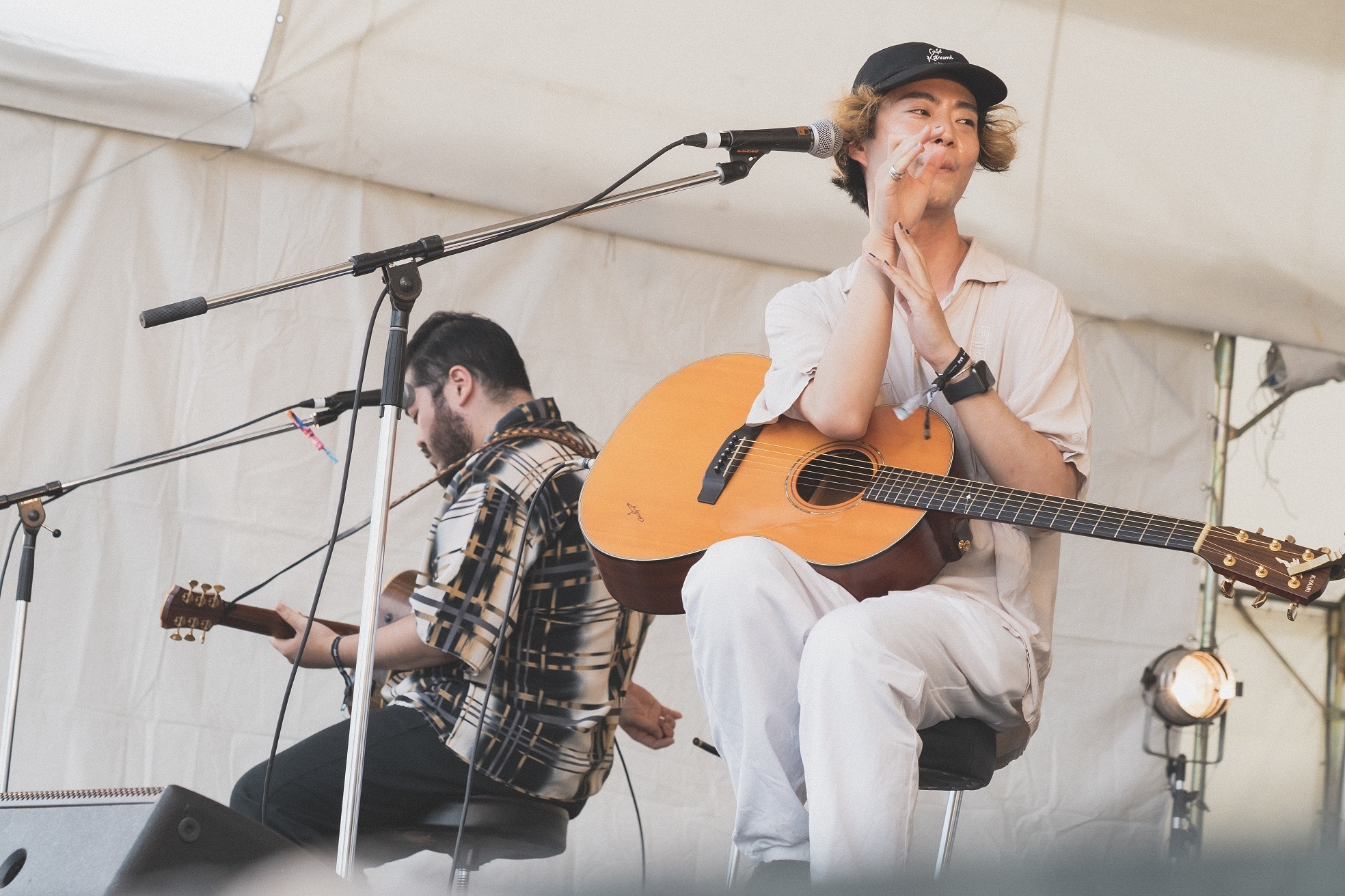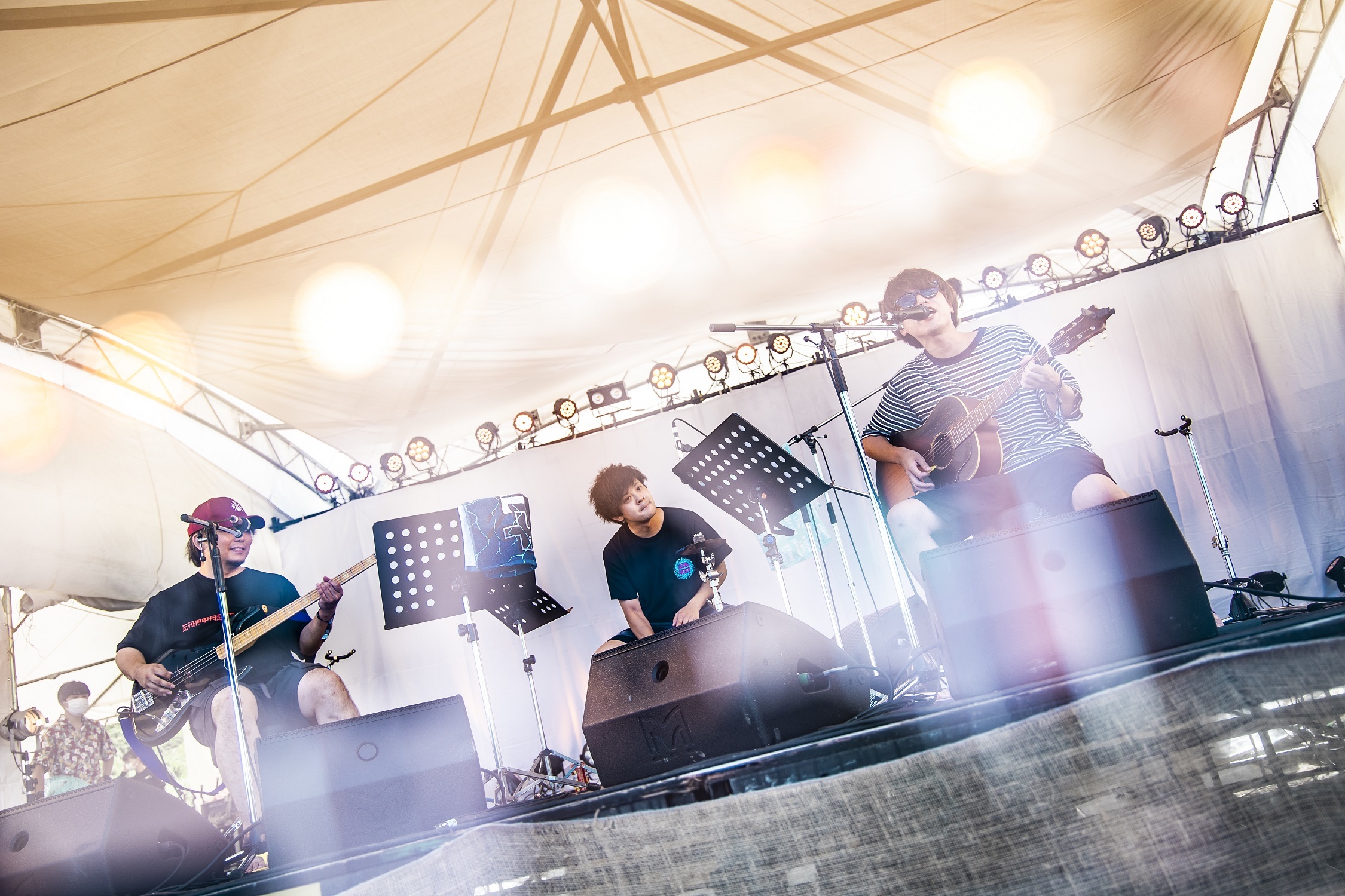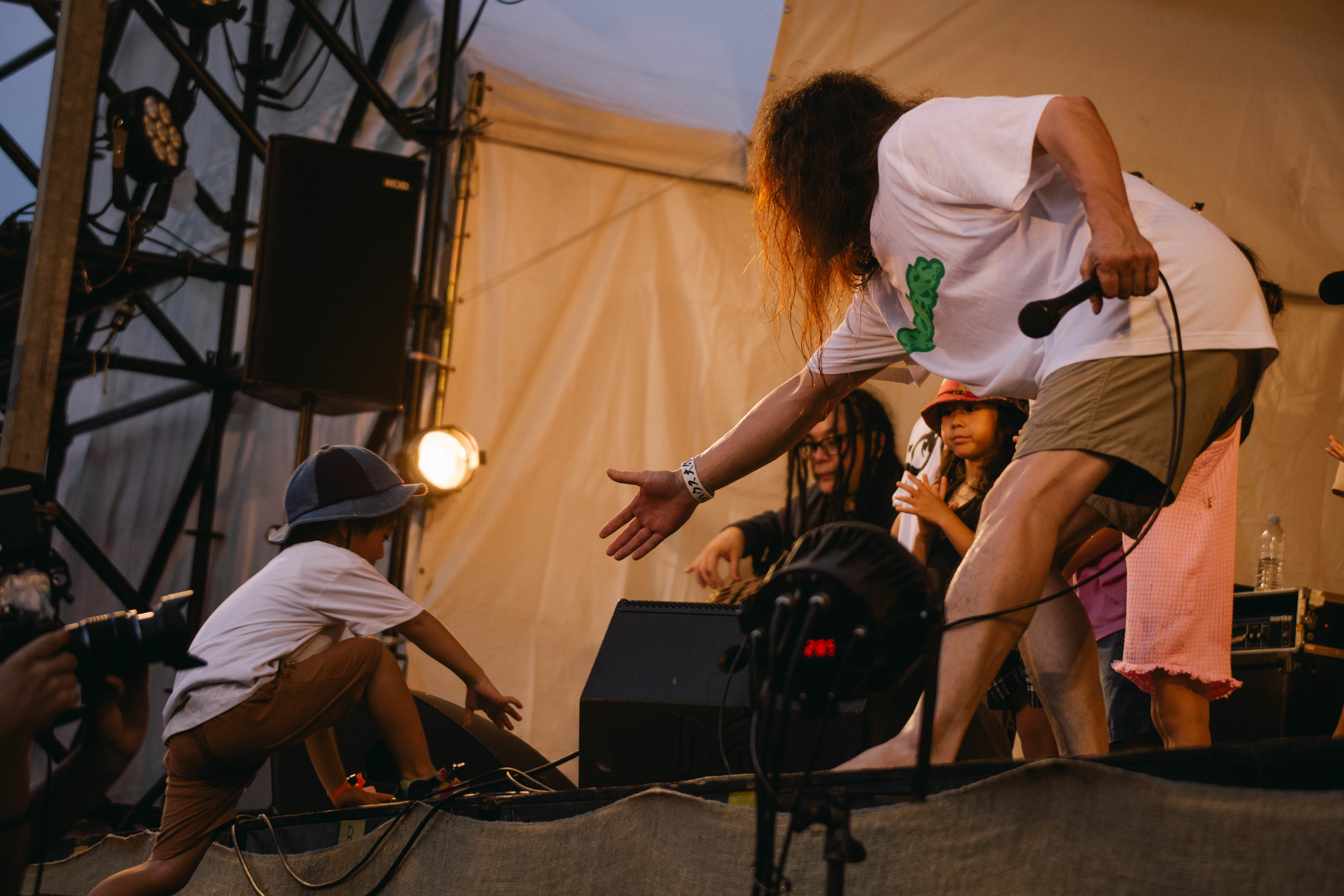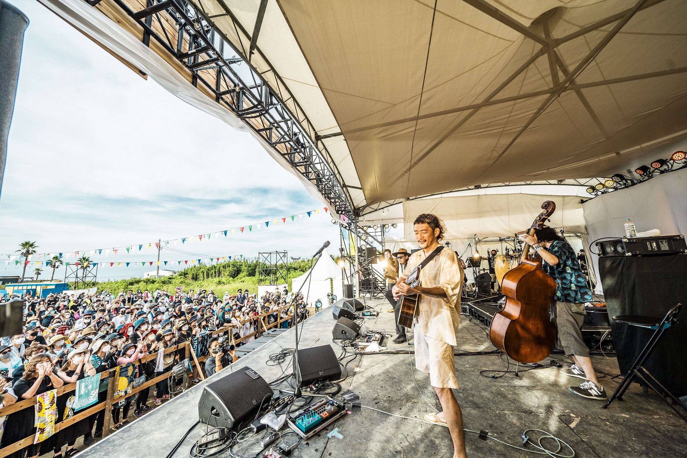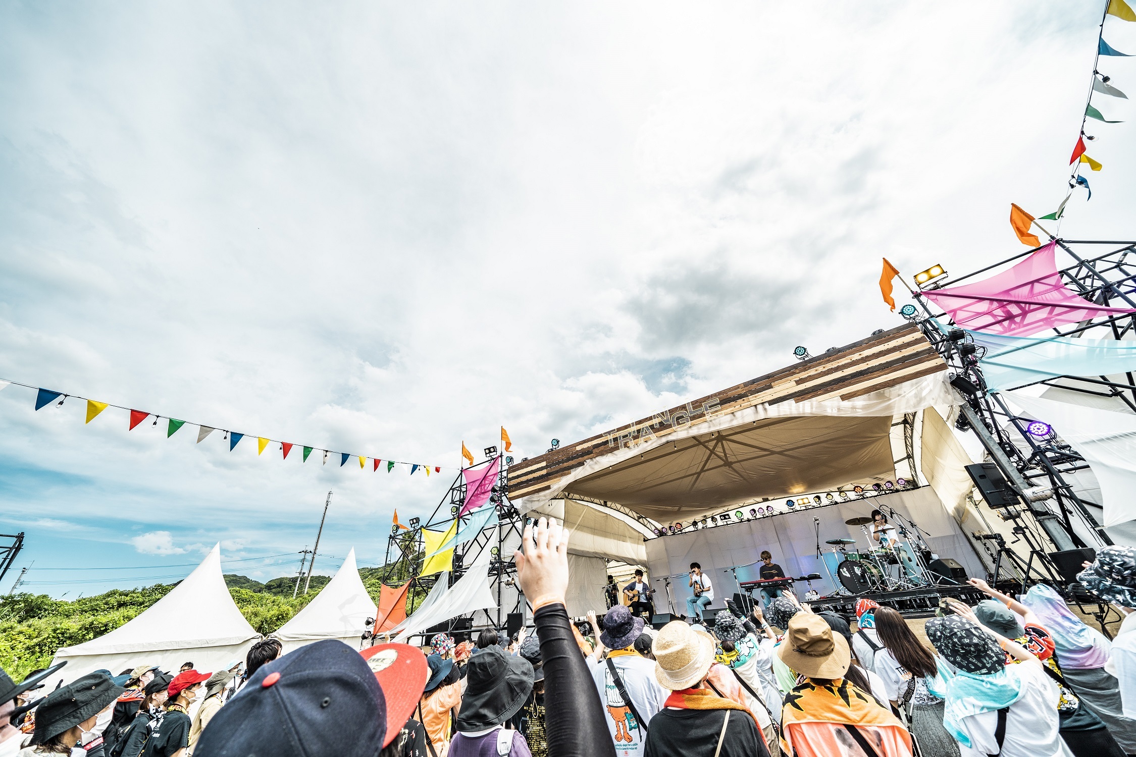 愛と温もりに溢れた「アンマー」、親友に語りかけるような「ユクイウタ」と続き、限りなく近しいところから鳴らされるギターと歌声にどっぷり浸ってると、始まったラストは「オワリはじまり」。牧歌的な演奏に乗せた、美しいメロディと歌詞に切なさと郷愁感のあるこの曲。個人的に聴くたび涙腺が緩んでしまう大好きな曲だが、もうすぐ陽が暮れて楽しすぎる一日が終わることの寂しさと、頬に吹き付ける夏の終わりを予感させる涼しい風といった、この瞬間の気持ちやシチュエーションとあまりにハマりすぎてて、溢れる涙が止まらなくなってしまった。優しく温かい彼らの人間的魅力や、楽曲の素晴らしさを存分に感じさせるステージだった。