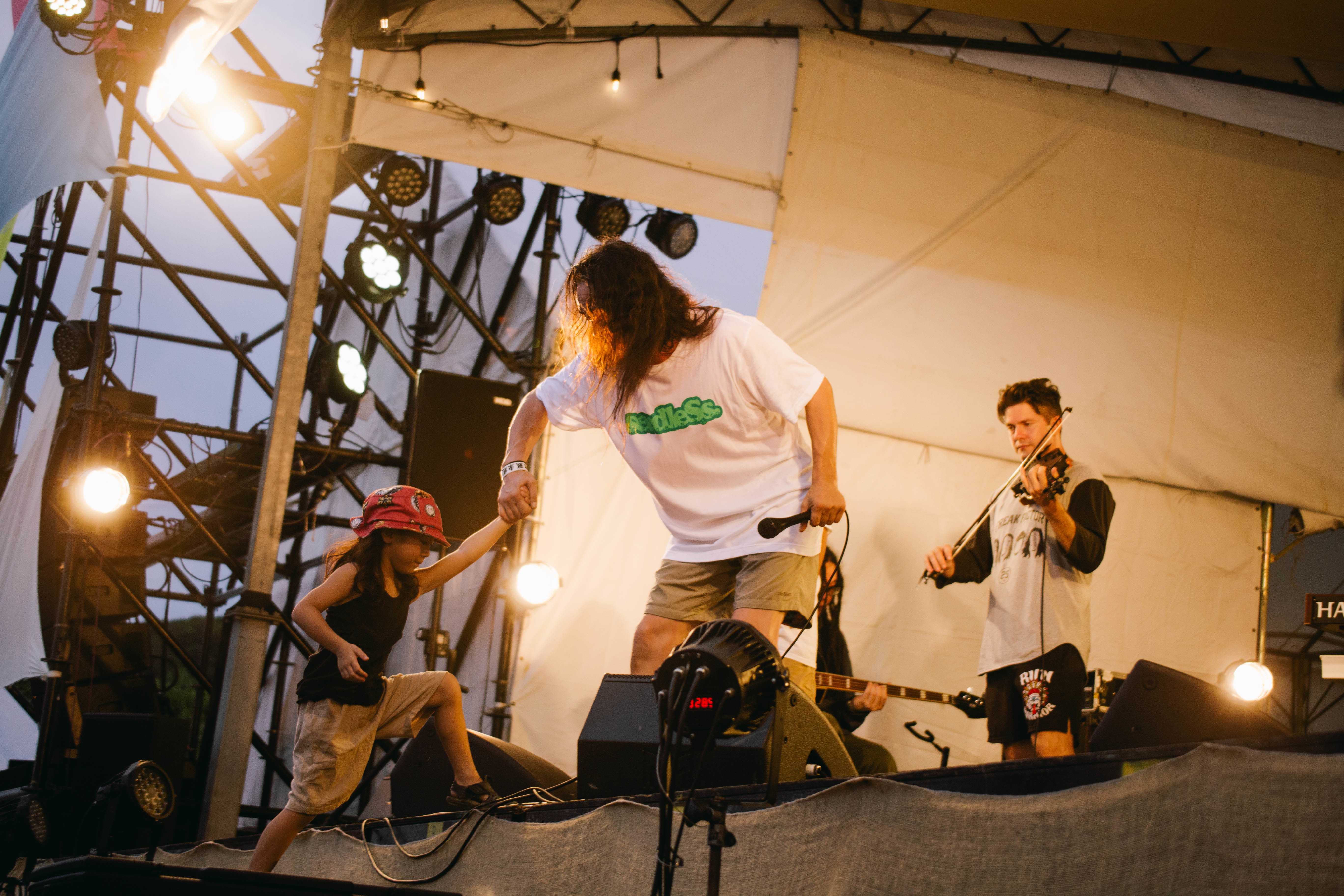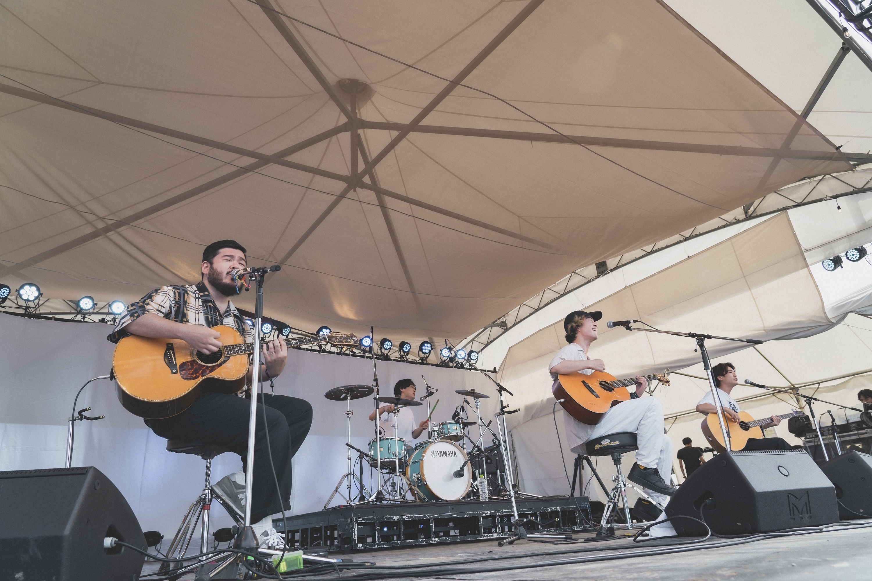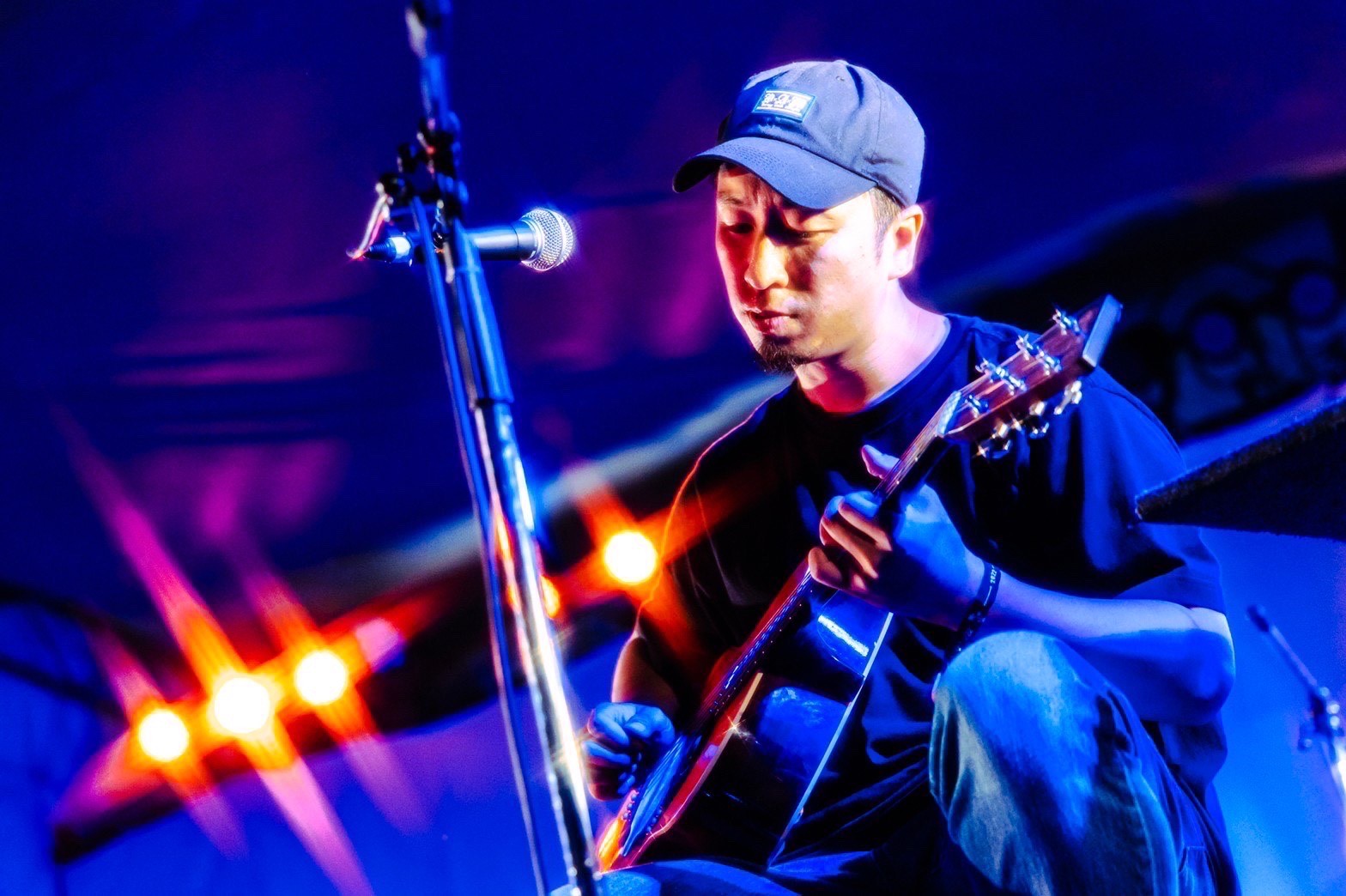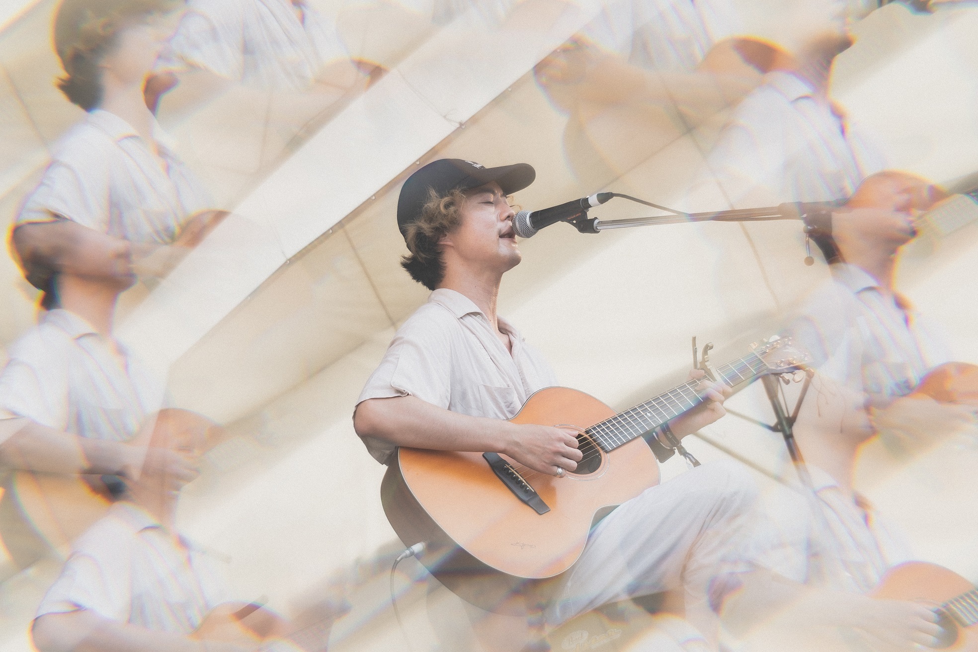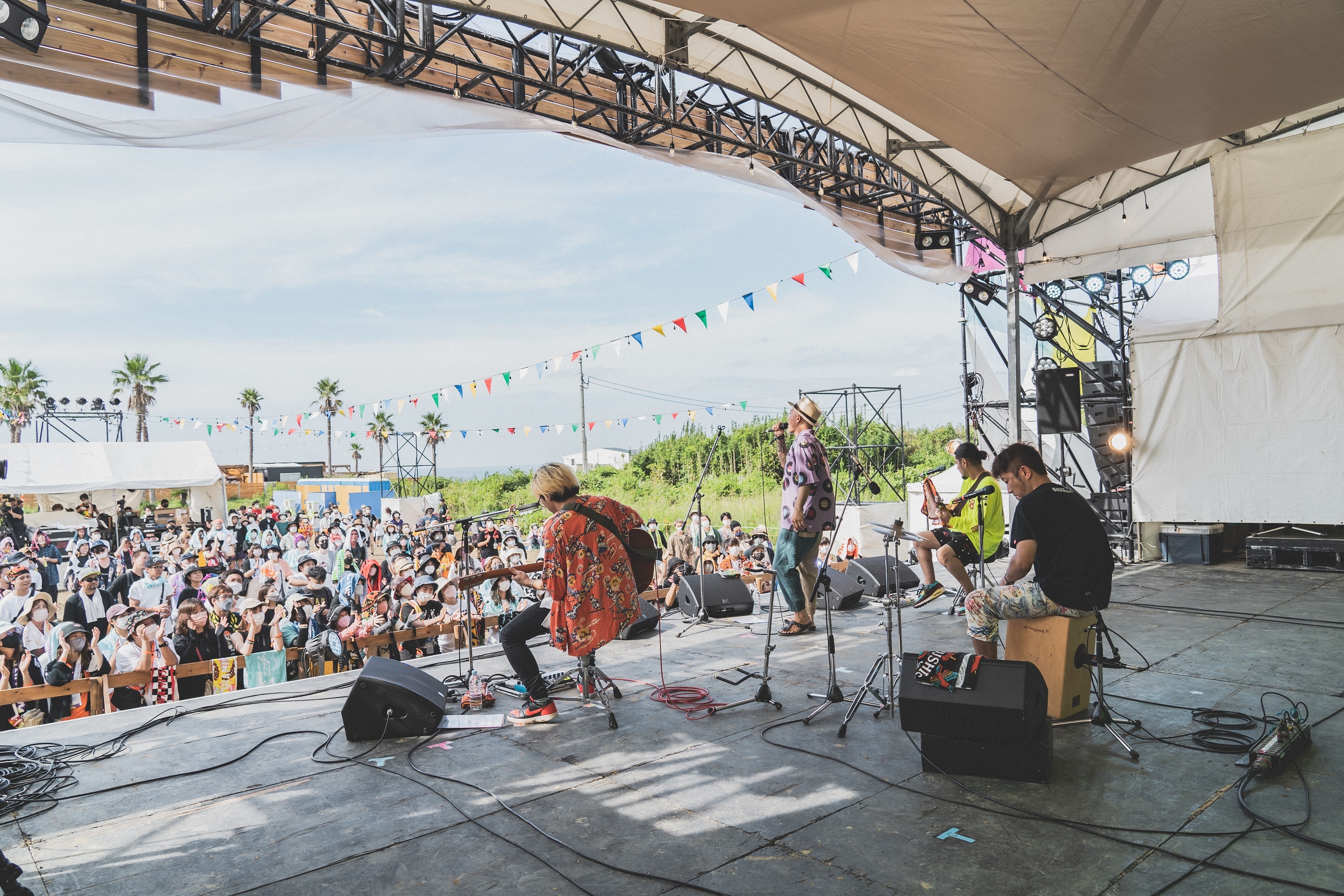 愛と温もりに溢れた「アンマー」、親友に語りかけるような「ユクイウタ」と続き、限りなく近しいところから鳴らされるギターと歌声にどっぷり浸ってると、始まったラストは「オワリはじまり」。牧歌的な演奏に乗せた、美しいメロディと歌詞に切なさと郷愁感のあるこの曲。個人的に聴くたび涙腺が緩んでしまう大好きな曲だが、もうすぐ陽が暮れて楽しすぎる一日が終わることの寂しさと、頬に吹き付ける夏の終わりを予感させる涼しい風といった、この瞬間の気持ちやシチュエーションとあまりにハマりすぎてて、溢れる涙が止まらなくなってしまった。優しく温かい彼らの人間的魅力や、楽曲の素晴らしさを存分に感じさせるステージだった。