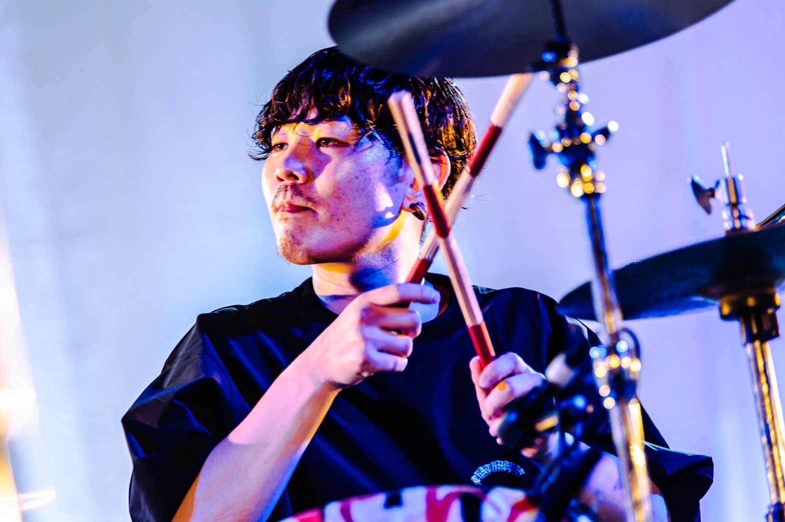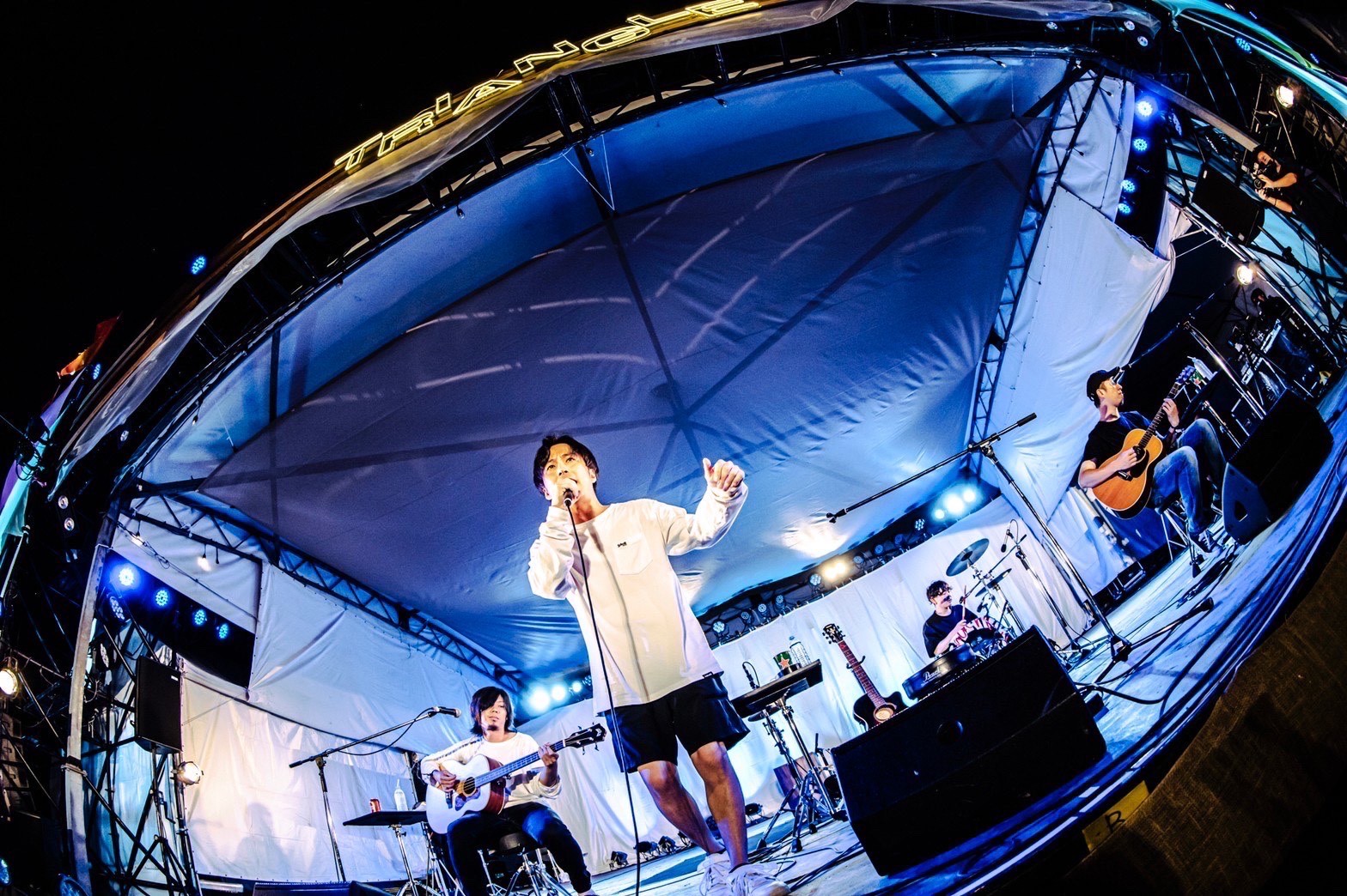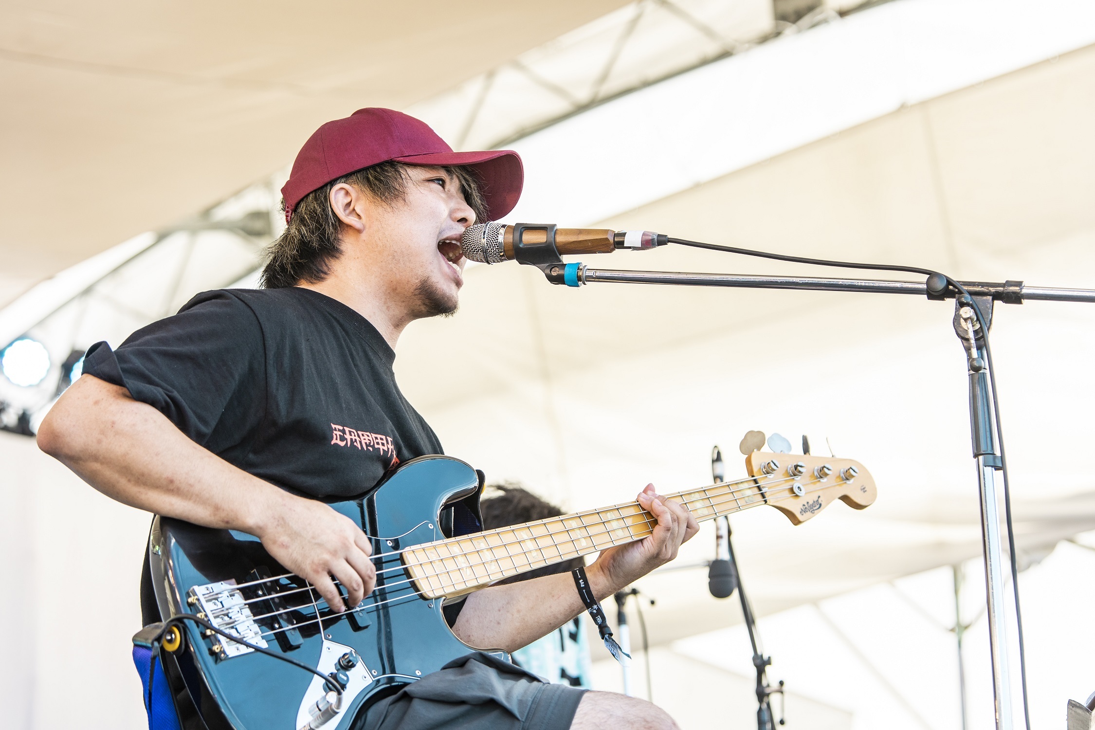 ヨコタ シンノスケ(Key&Ve)の奏でる鍵盤ハーモニカの音色が絶妙なアクセントとなった「推しのいる生活」から、「一番の挑戦曲! 全員の美声に注目して下さい」と始まった曲は、RIP SLYMEのカバーで「楽園ベイベー」。4人がマイクを繋ぎ、演奏しながらのラップに挑戦したこの曲。しっかり歌えてたし、グルーヴも出てたし、なにより会場の雰囲気と抜群にマッチして、めちゃくちゃ楽しい! 「意外といけたな」と安心した表情で語るソゴウ タイスケ(Dr)にフィールドから拍手が起き、満足そうな4人。ジャジーなアレンジの「お願いシェンロン」でセイヤがかめはめ波や元気玉のポーズを決めると、ラストは「The Band」「また明日」をしっかり聴かせてフィニッシュ。緩急付けた満足度の高いステージに、「良いバンドだなぁ!」と改めて思わされた。