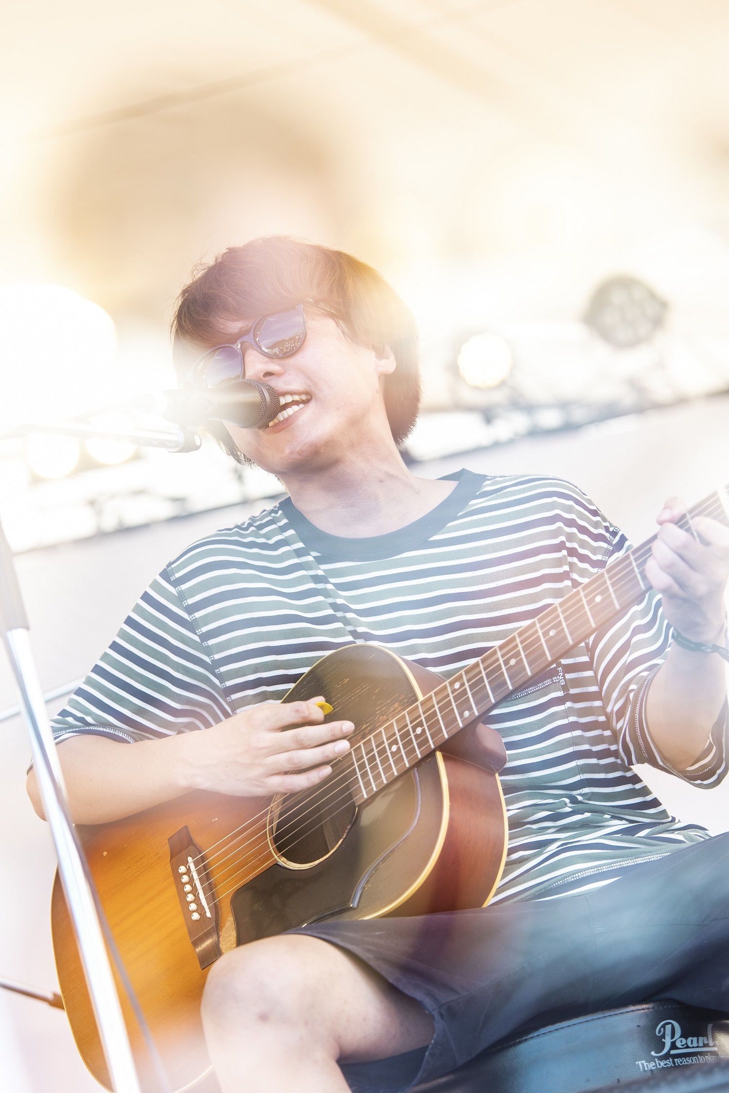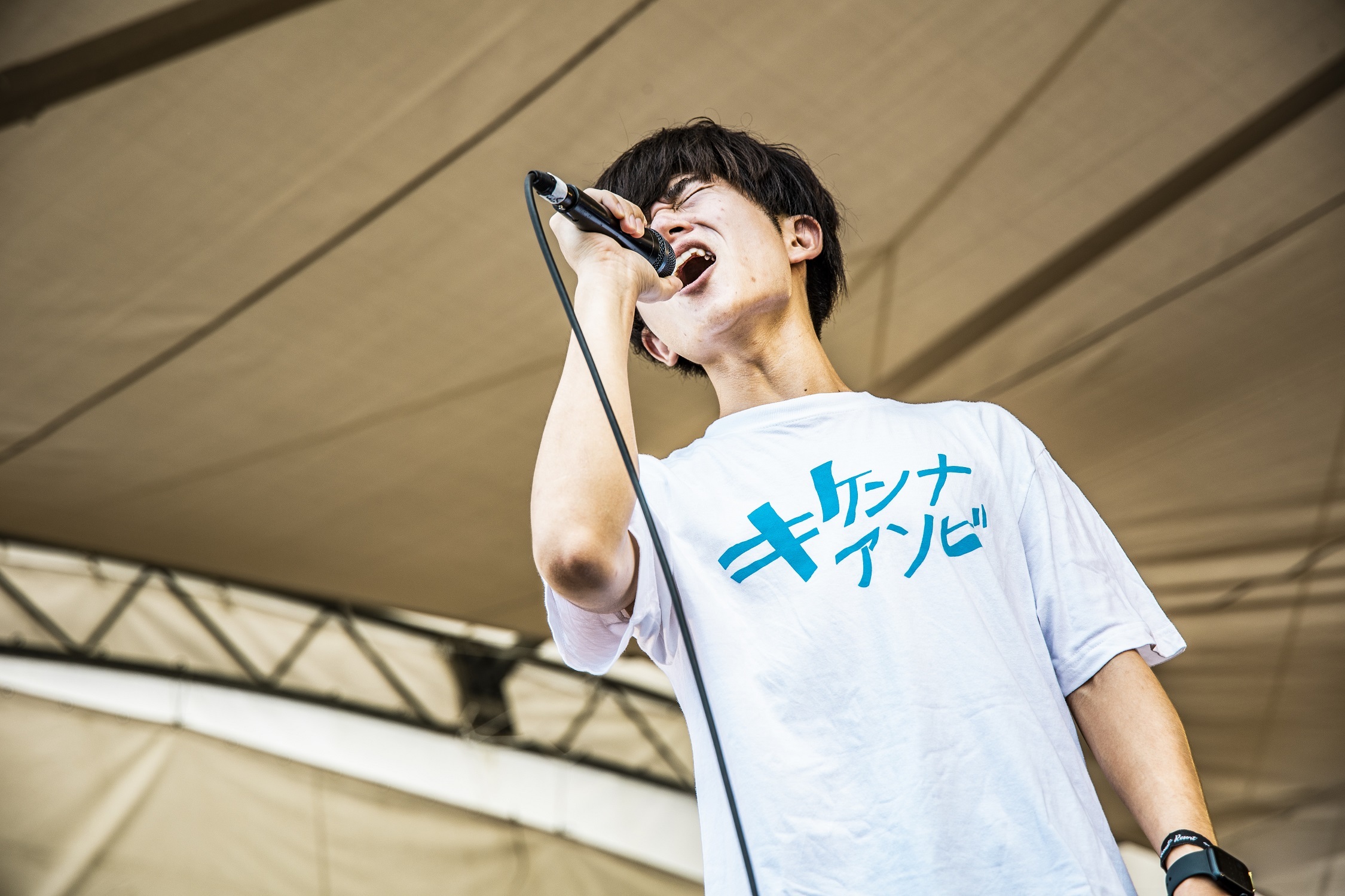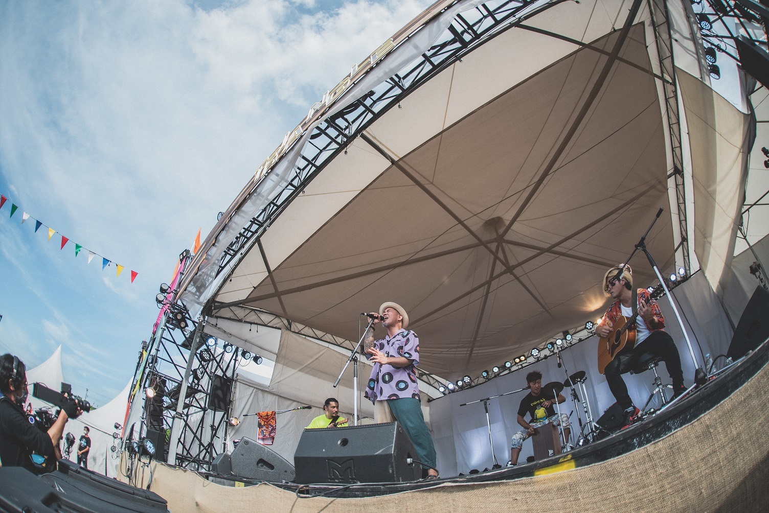 眩しい太陽が照らすステージに、ハットとサングラスに浮き輪姿という、リゾート感満点のスタイルの末武竜之介(Vo&Gt)が登場。おもむろにギターをかき鳴らしてひと節歌うと、「KUZIRAです、お願いします!」と挨拶。爽やかなアコースティックサウンドと抜けるような歌声を青空に響かせた「Backward」で、2日目の幕を明ける。「気持ちいい! 超気持ちいいんだけど!!」と笑顔を見せた末武は、「初めてアコースティックライブするんだけど、KUZIRAの曲合うっしょ? ビールでも飲みながら聴いて下さい」と観客に語りかけ、缶ビールを掲げて乾杯!