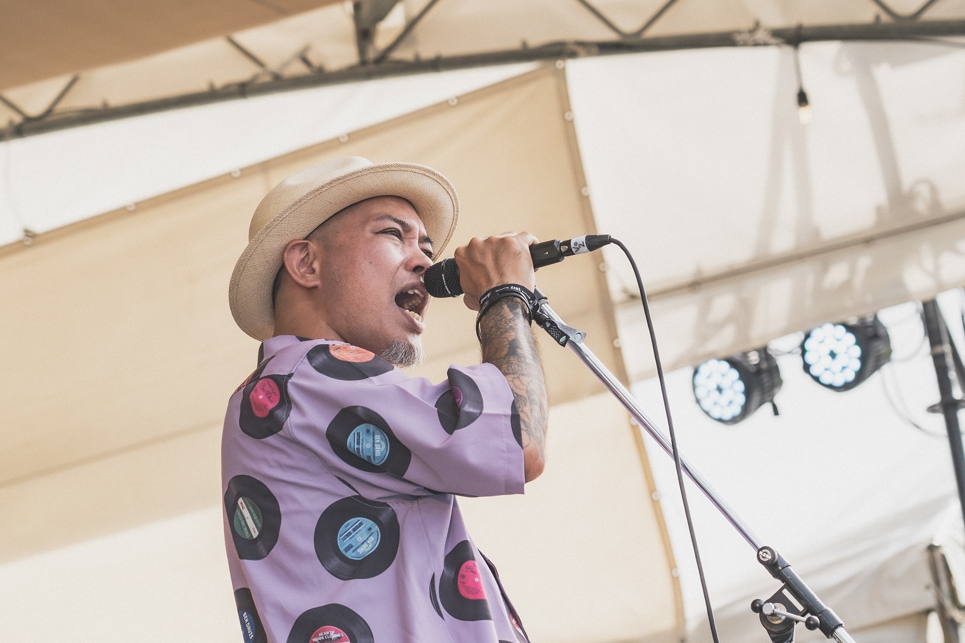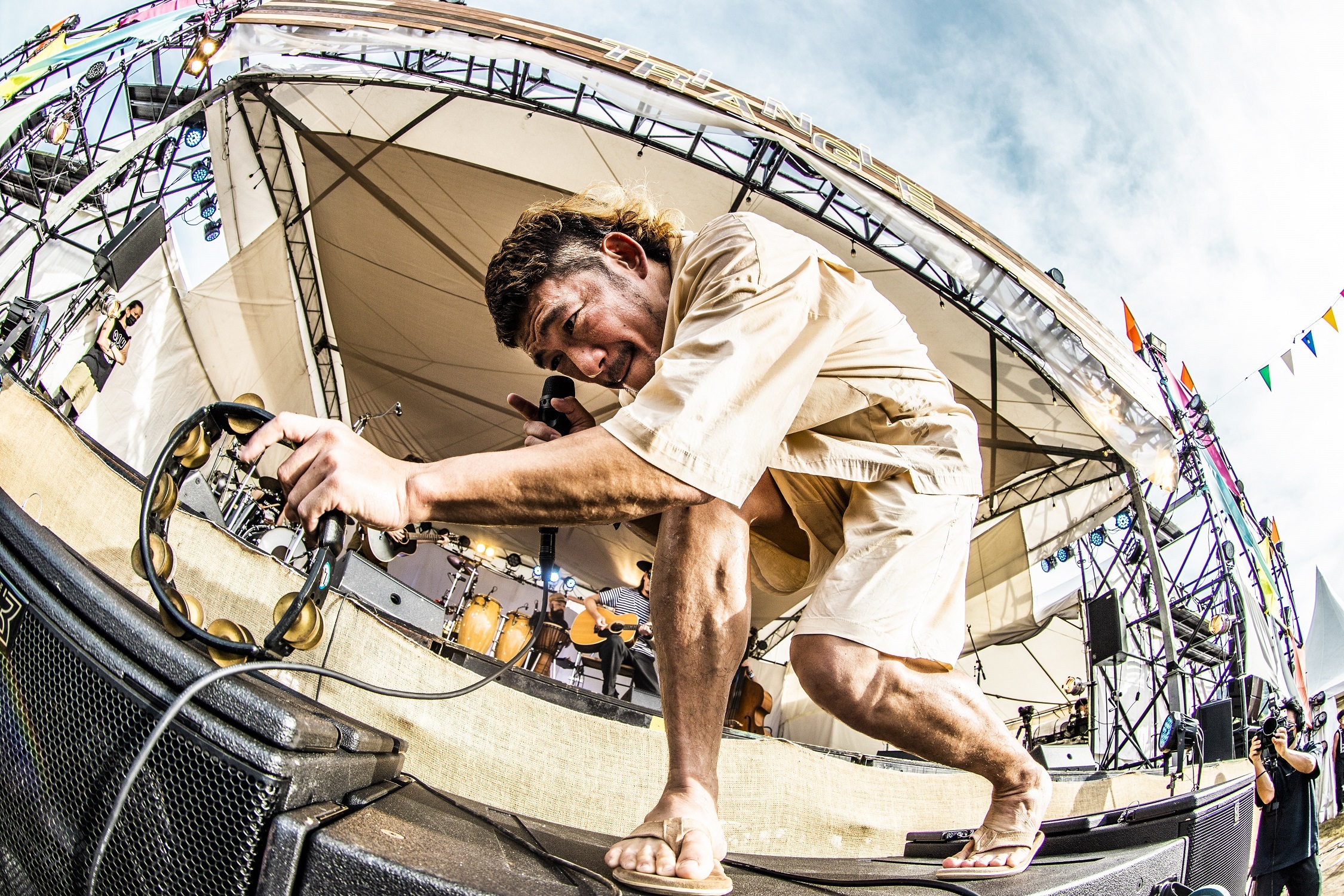 だんだんと陽が落ち始め、会場が涼しくなって来た頃。ステージに登場したのは、G-FREAK FACTORY。1曲目「Unscramble」から、ゆったりしたレゲエサウンドや絞り上げるような茂木洋晃(Vo)の歌声、印象的な鍵盤の音が夕暮れ時の会場とばっちりマッチし、会場中が手を上げて、心地よさそうに体を揺らす。軽快な曲調に茂木のラップも痛快な「日はまだ高く」でさらに踊らせると、「こんだけ人がいたら価値観それぞれだと思うけど、全部が正解だし、全部が間違いだと思う。だから次のとこ行こうよ。互いに信じ合うことこそが、次に向かうべきところだと思います」と茂木が告げ、熱いメッセージを込めた「Fire」へ。温かみあるアコースティックサウンドに熱い魂を乗せ、<Keep on fire>と願いを込めて高らかに歌う。続く「EVEN」では片平里菜をゲストボーカルに迎えて、「見て下さい、この美女と野獣感!」と笑いながら、力強く愛と希望に溢れたハーモニーを聴かせる。