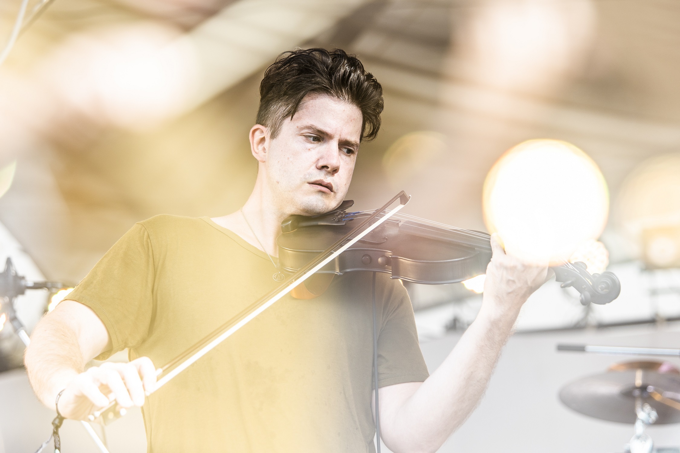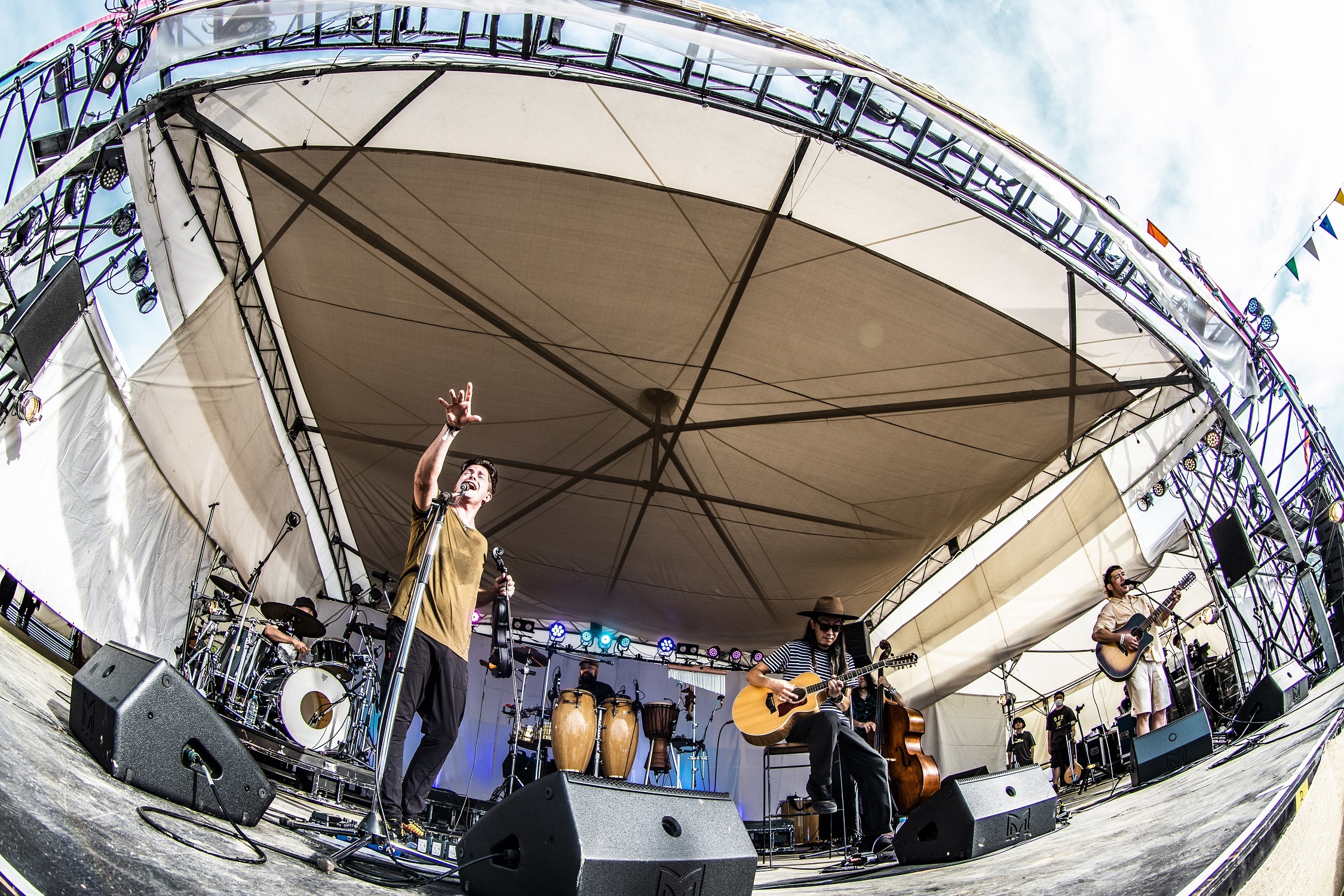 暑く熱いフィールドに涼しく爽やかな風が吹き付ける頃、会場の雰囲気にピッタリな美しい演奏と綺麗なハイトーンを響かせた「Hallelujah」で、ライブをスタートしたFIVE NEW OLD。「いい天気でよかったね、本当に。いつもと違った非日常的な素晴らしい場所で、僕たちの音楽を楽しんでって下さい」とHIROSHI(Vo&Gt)が挨拶すると、「What’s Gonna Be?」に明るくクラップを合わせて、「Ghost In My Place」の心地よいグルーヴに体を揺す観客がステージに酔いしれる。