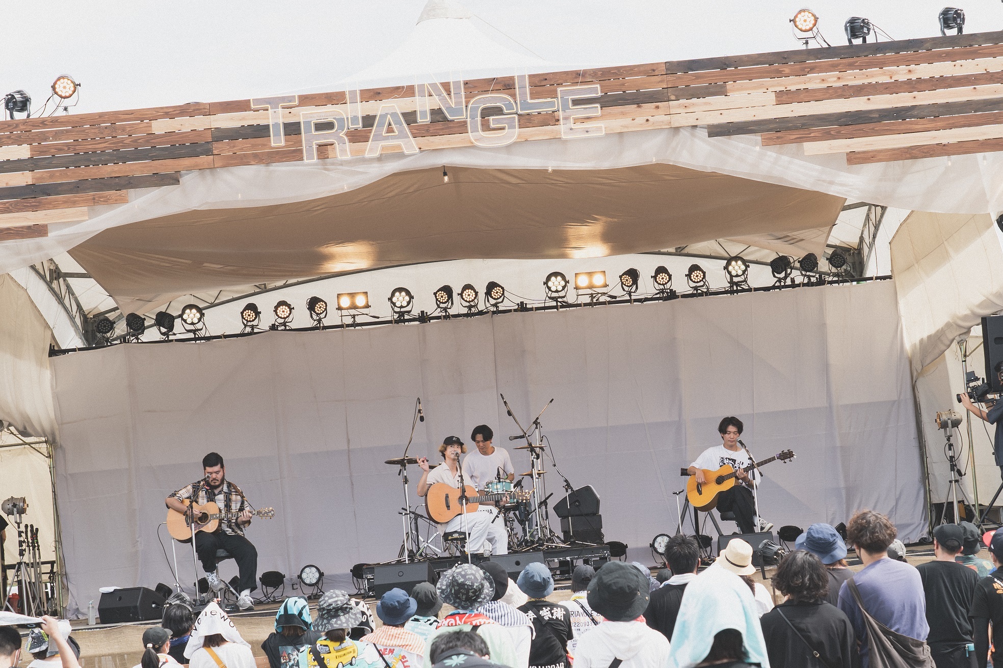2日間に渡って行われた『TRIANGLE'22 Acoustic Resort』の大トリであり、3イベント9公演を行ってきた『TRIANGLE'22』を締めくくったのは、九州は長崎出身のSHANK。大トリのプレッシャーを感じさせない軽快さでステージに登場すると、ゆったり力強い歌とギター、タイトなリズム隊による「Surface」でライブスタート。庵原将平(Vo/Ba)が「ブタゴリラとジャイアンが出た後にスネオが出てきた」と自己紹介して観客を笑わせると、バンドの持ち味である痛快さと爽快さを併せ持った「Rising Down」でフィールドを沸かす。ライブハウスさながらのドライブ感ある演奏に観客の拳が上がった「Smash The Babylon」で、こんなアコースティックスタイルもアリなことを証明すると、「Movie」ではアコースティックならではのどっしりした歌と演奏でしっかり魅せる。
