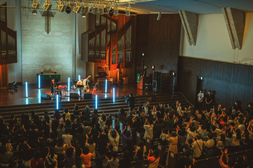 厳かな雰囲気のガウチャー記念礼拝堂にアコースティックギターを携え、川上がひとり登場。静けさの中、おもむろに [Alexandros]のサードアルバム『Schwarzenegger』のラストを飾る名曲「真夜中」を演奏する。しっとりとした歌とアコギの音がどこか神聖な空気をまといながら、礼拝堂内に響き渡る。続いては「city」。原曲は「前に前に」というエネルギーが詰まった疾走感のある楽曲だが、それとは大きく違う表情を見せる。ただ、徐々に演奏と歌はスピード感を帯び、オーディエンスの心をパワフルにつかむ。川上は「Thank You」と呟くように口にし、笑顔を浮かべながら次の曲に向かう。アコギを奏でながら、「今日はわが母校に来てくれてありがとう! 第29回 青山学院大学同窓祭ということでお招きいただきありがとうございます! 声は出せないと思いますが手を叩いて大盛り上がりしましょう!」と言って、「アルペジオ」へ。アコギと歌だけでダイナミックな音像を描いていく。