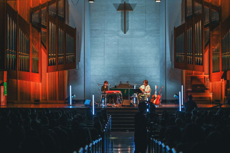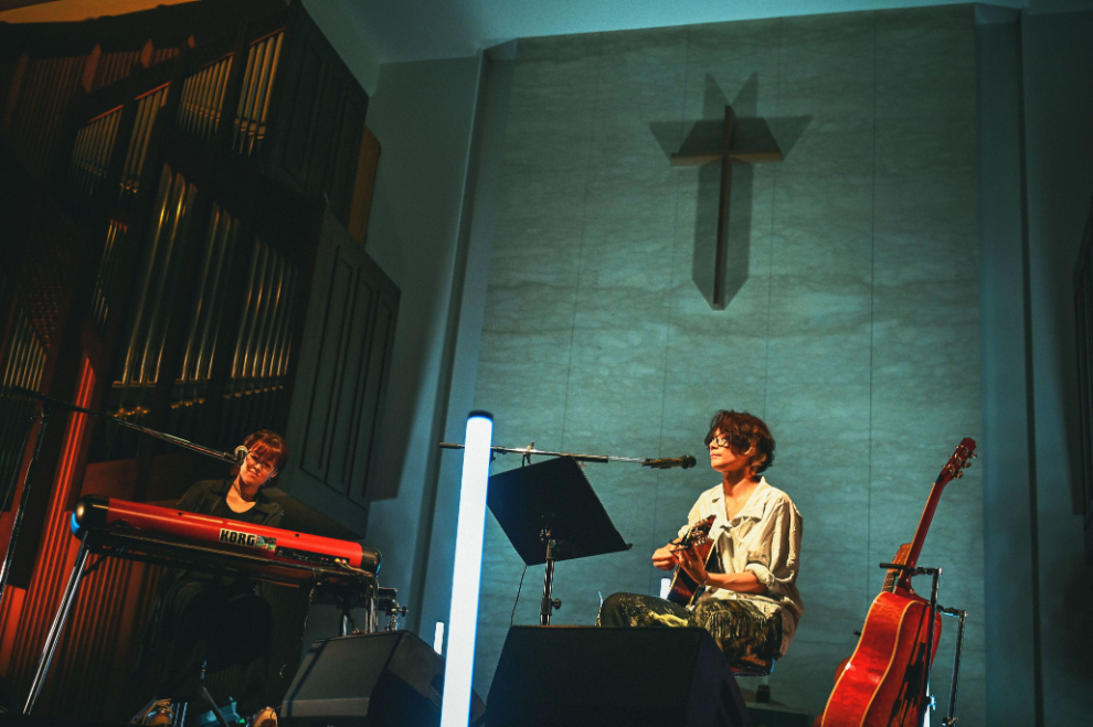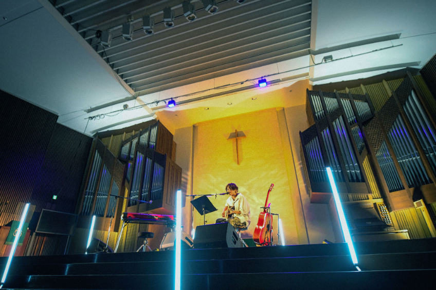 「僕は青山学院大学のOBなんですけど、多分このチャペルに入ったのほぼ初めてなんですよね。ロックバンドをやってると無縁だと思ってました。普段は牧師さんがいらっしゃるようなところでアコギをかき鳴らして良いのかな?って思います」と言い、母校であり[Alexandros]結成の地であるこの場所への敬意を払う。さらに、「2年留年した自分が本当にここでライブをやっていいのでしょうか?(笑)」と自虐を交え再びオーディエンスに確認し、場内をほっこりさせる。