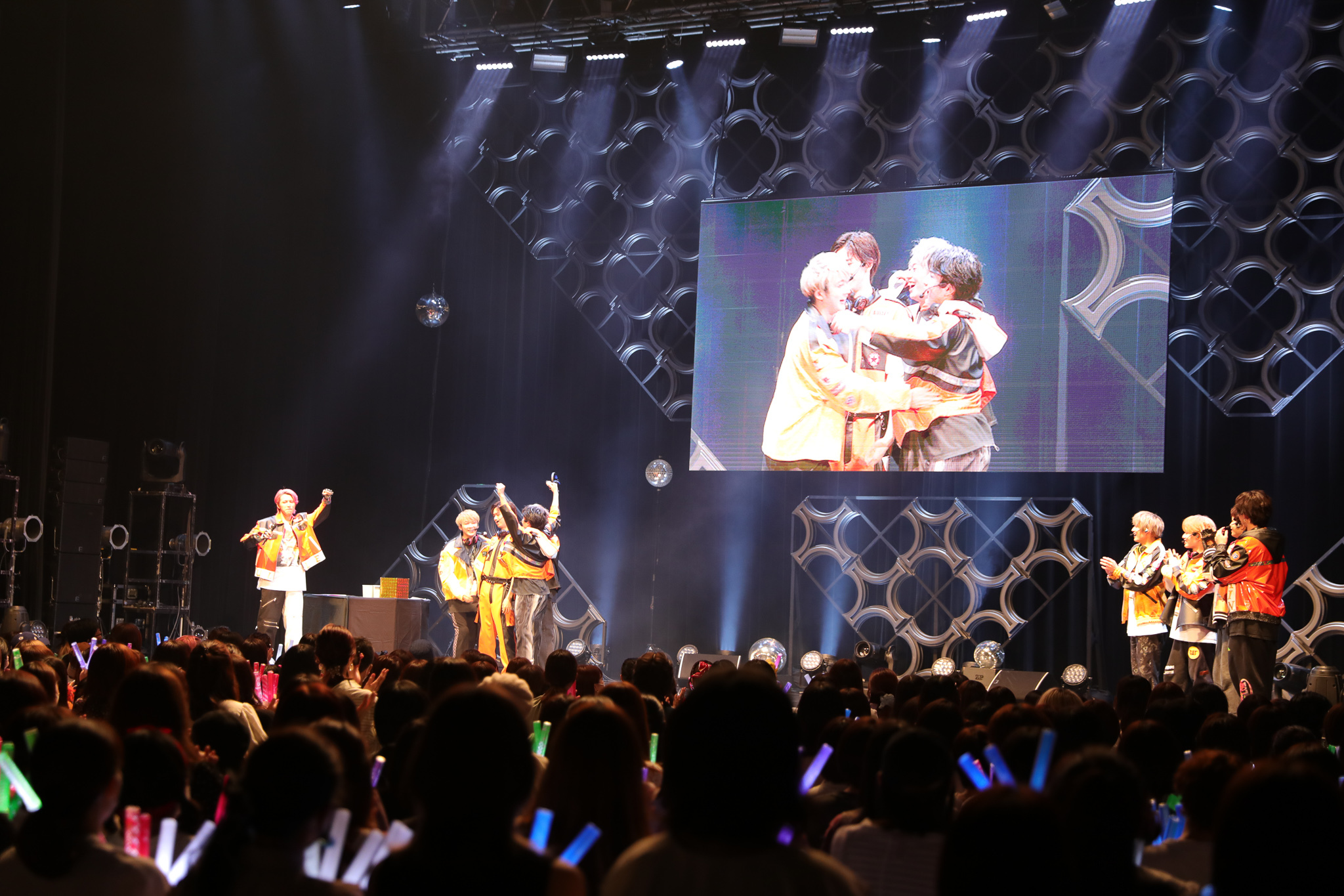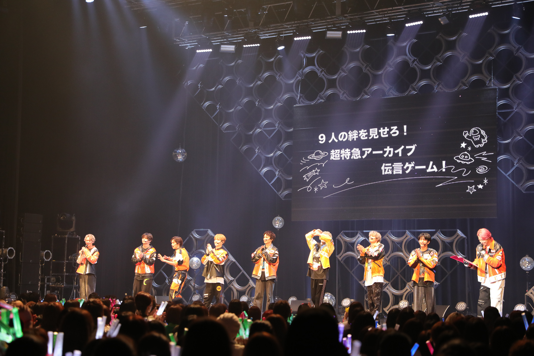黒とオレンジベースの鮮やかな新衣装をまとった9人が舞台に登場して、まず始まったのはゲームコーナー。昼の1部では各メンバーが激レアな体験を明かし、同じ経験のある8号車にペンライトを振ってもらって、その数が少ない方が勝ちという“激レアエピソード!オンリーワンを目指せ!”が行われた。MCを担当するユーキ以外の8人が“宇宙チーム”と“ドライブチーム”の2つに分かれ、「2メートルくらいの高さから落ちて鼻を骨折したことがある」というハルに、タクヤは「今は立派な鼻になってる。鼻って骨折すると高くなるんですか? 折ろうぜ、後で!(笑)」と意気込む場面も。マサヒロは「小学生のとき水泳で市内1位になったことがある」で対抗するものの、意外にも10人ほどのペンライトがあがってハルの勝利となる。第2試合ではアロハが「ゆで卵を初めて見たとき、ヒヨコが出てきそうで食べられなかった、シューヤが「朝起きて黒マスクをつけようとしたとき、両サイドとも紐がちぎれた」と、互いにピンポイントすぎる体験を語るが、結果は両者とも6人で引き分け。「サッカーの試合で膝を怪我して、出場から20秒で退場したことがある」というカイは、「スポーツの試合で1分以内に退場したことがある人」と条件を緩めたのが災いし、「都内から江ノ島まで自転車で往復したことがある」というカードを切ったタクヤに大敗する。