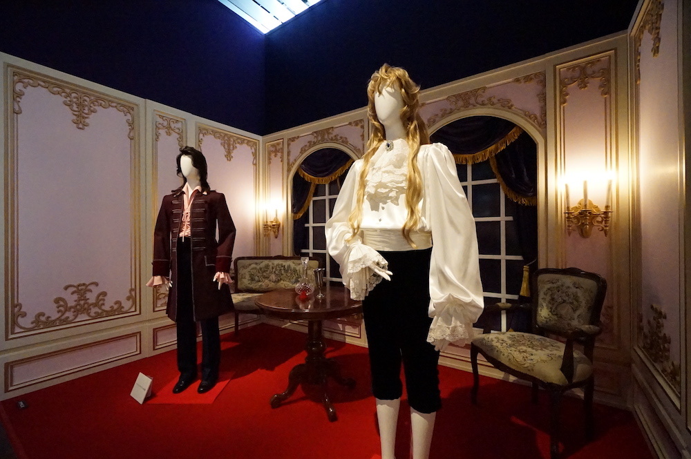 オスカルの居間をイメージした空間に、オスカルとアンドレの舞台衣装が並ベて展示されている。マネキンであっても一歩後ろに控える従僕アンドレの立ち位置が好ましい。