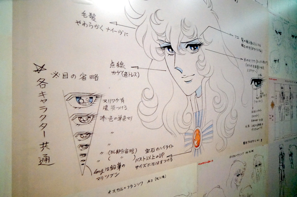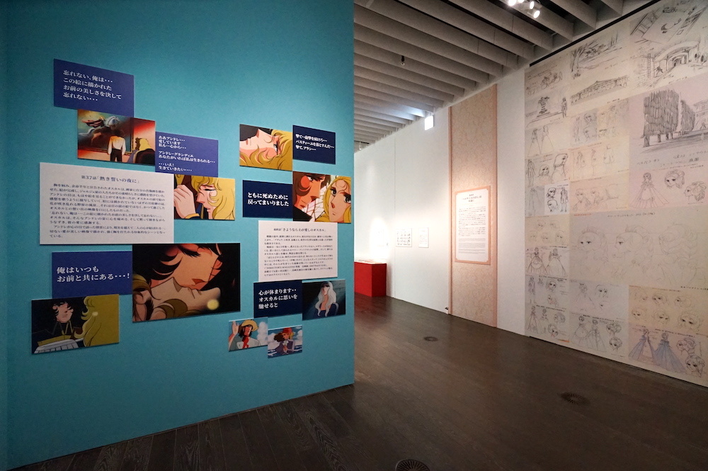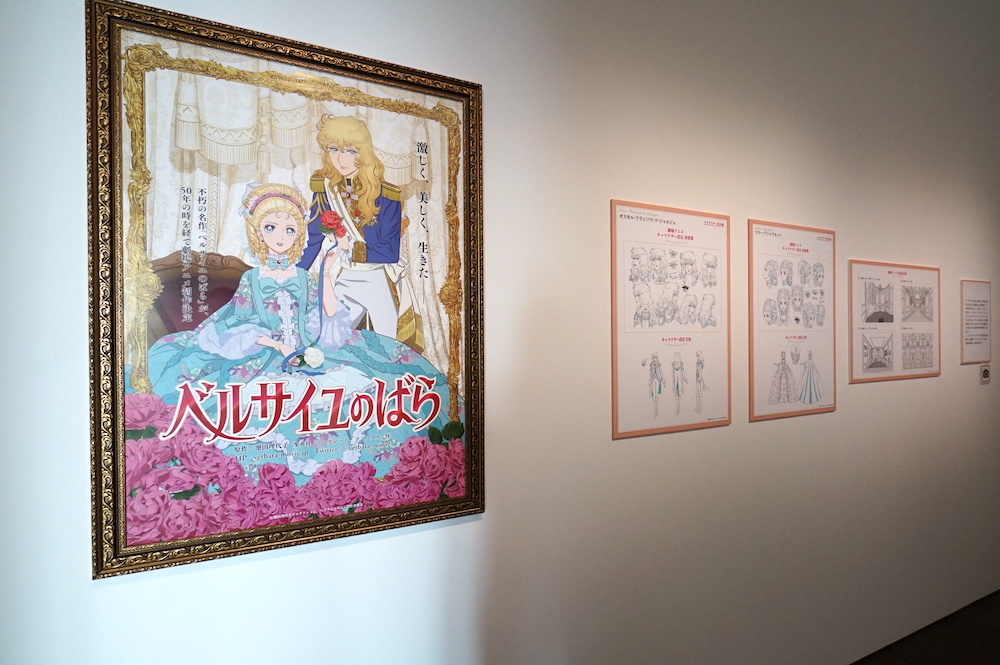 壁一面にレイアウトされた、人物や背景の設定資料。アニメ版のファンなら、きっとこのコーナーにいる間ずっとオープニング曲「薔薇は美しく散る」が脳内再生されることだろう。