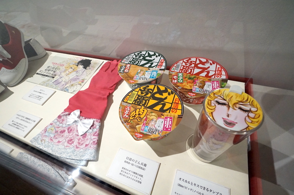 2017年に迎えた45周年記念の際には、カップうどんのパッケージや、お菓子のノベルティにも登場している。ちなみに右端は江崎グリコ「Bitte」とのコラボで、抽選で5,000名に進呈された「オスカルとキスできるタンブラー」。本当に、咲く場所を選ばないバラである。