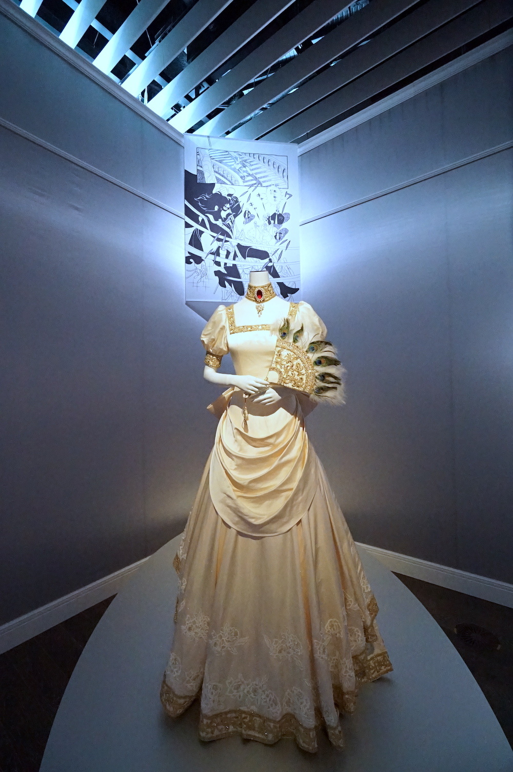 原画に交えて展示されている、オスカルの再現ドレスにもぜひご注目を。男装の麗人であるオスカルが生涯で一度だけ身につけてフェルゼンと踊った、思い出のドレスだ。アイボリーホワイトのシルクサテンを贅沢に使ったドレスの美しさも溜め息モノだが、オスカルのスーパーモデル並の体型を想定したマネキンにも衝撃を受ける。まさに「まるで彫刻のように美しいかた!」である。