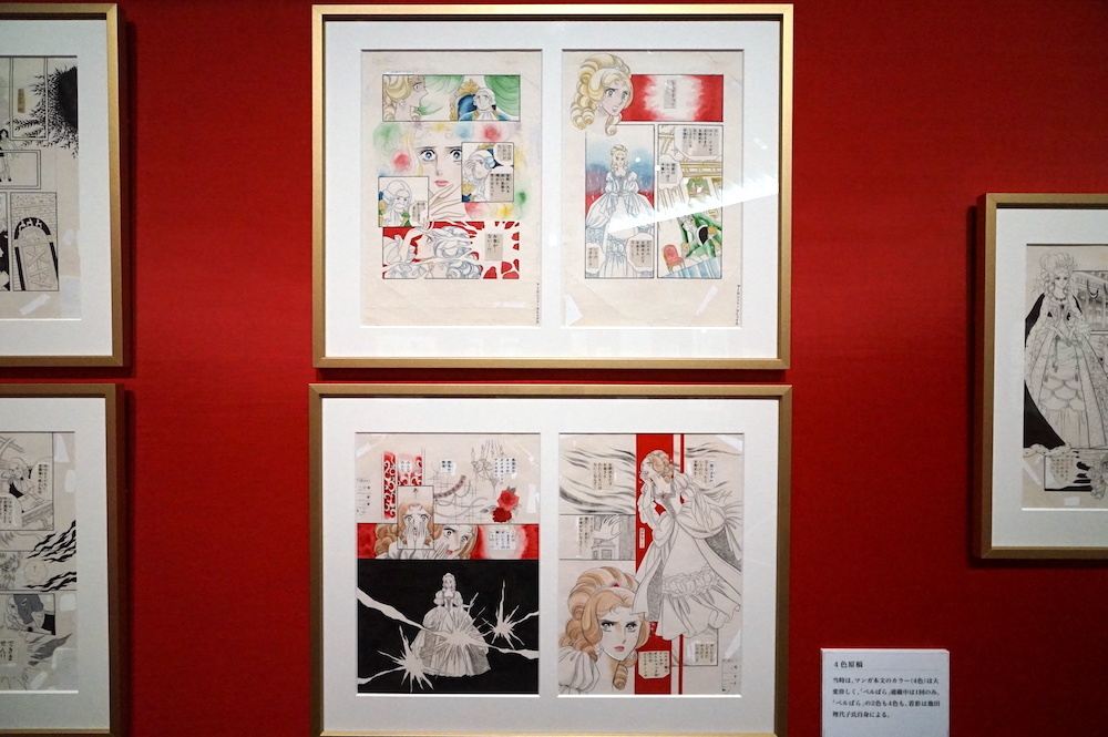 原画は白黒、カラーのほかに、少し珍しい2色のものなどが存在する。当時は雑誌の多色刷りが難しかったため、人気作品だけに許された趣向だったようだ。写真は連載中唯一という、レアな4色原稿。国庫にお金がない?! という事実をにわかに受け入れられないマリー・アントワネットの脳内が、赤・黄・青・緑の4色でホワワ〜ンと表現されていて面白い。
