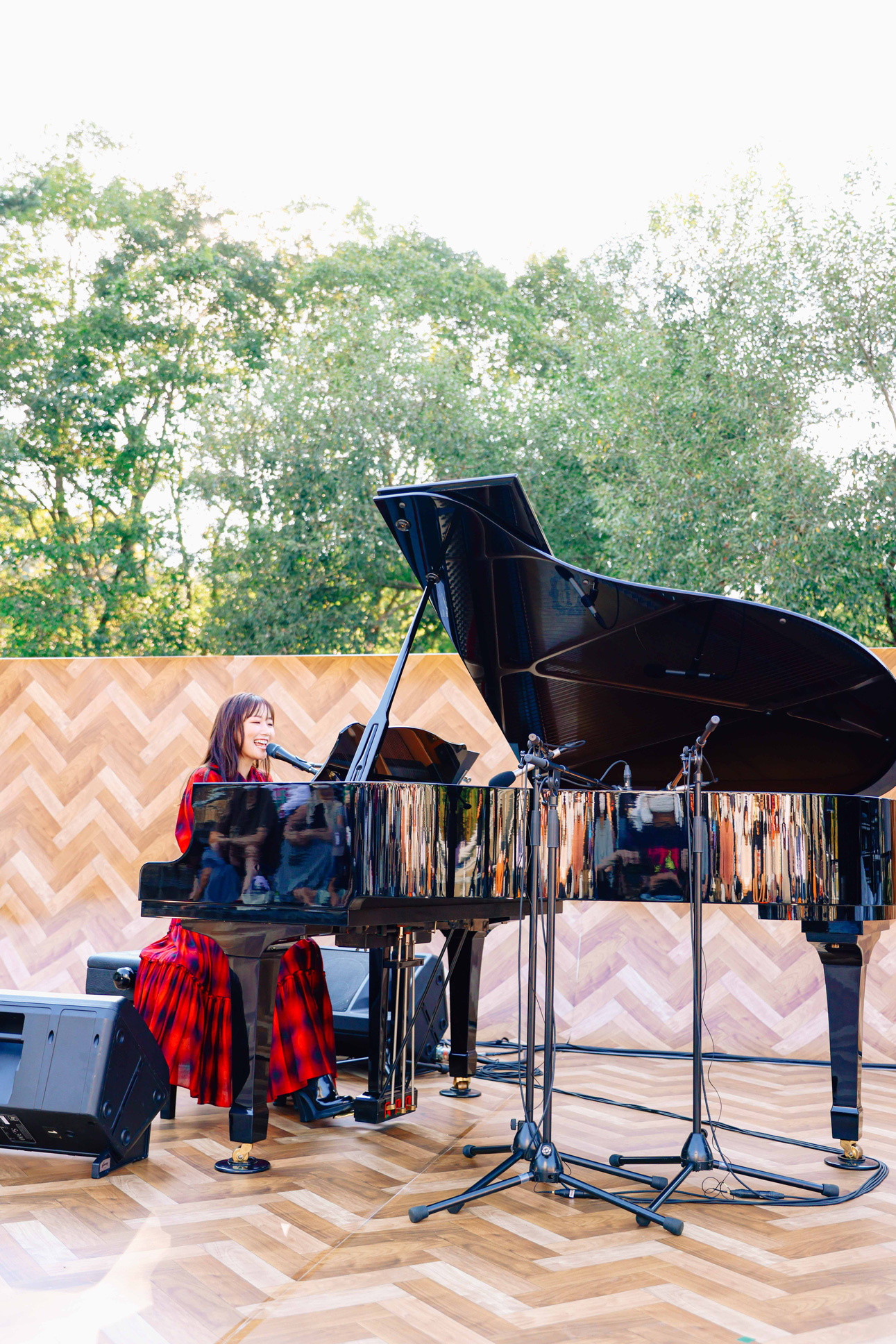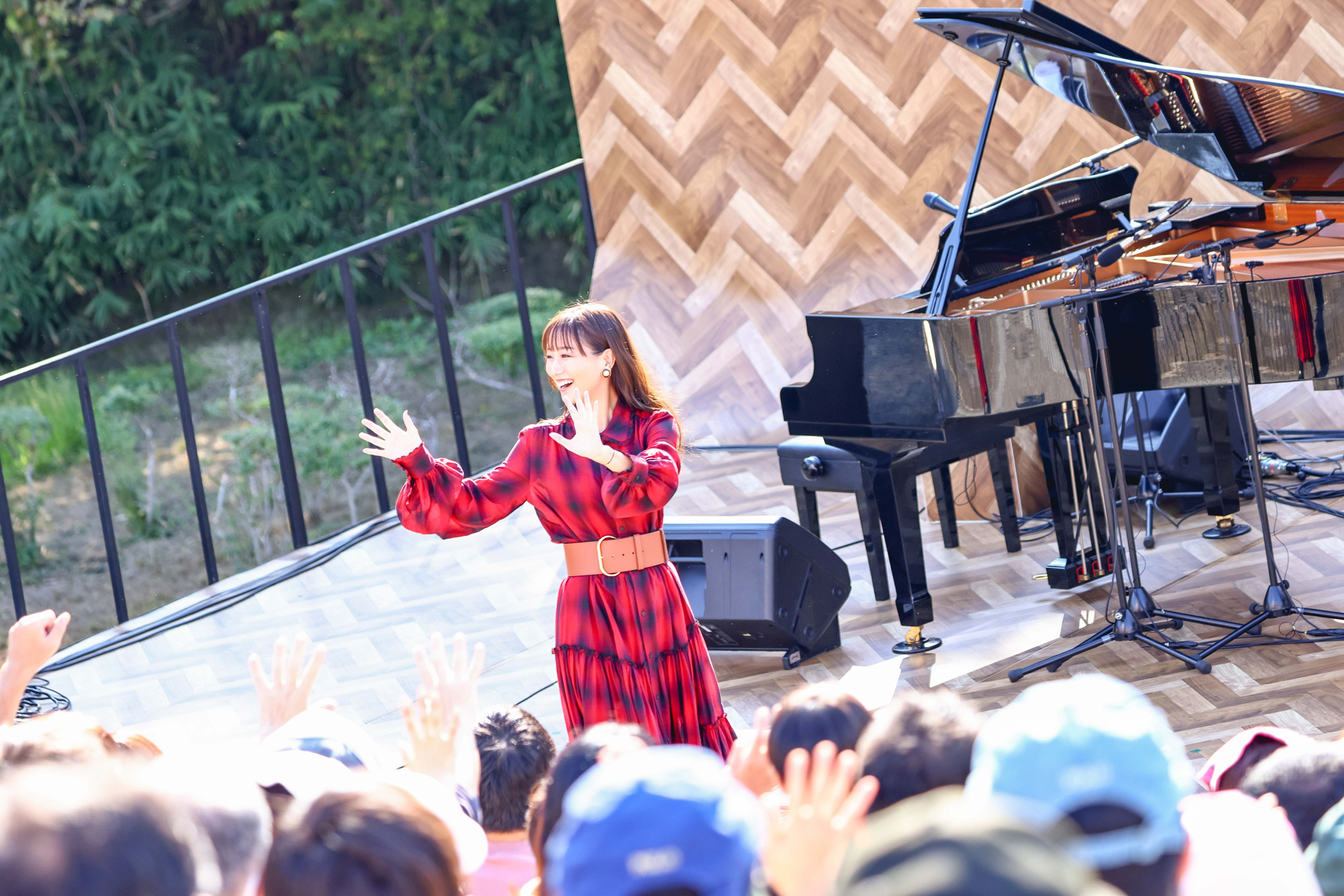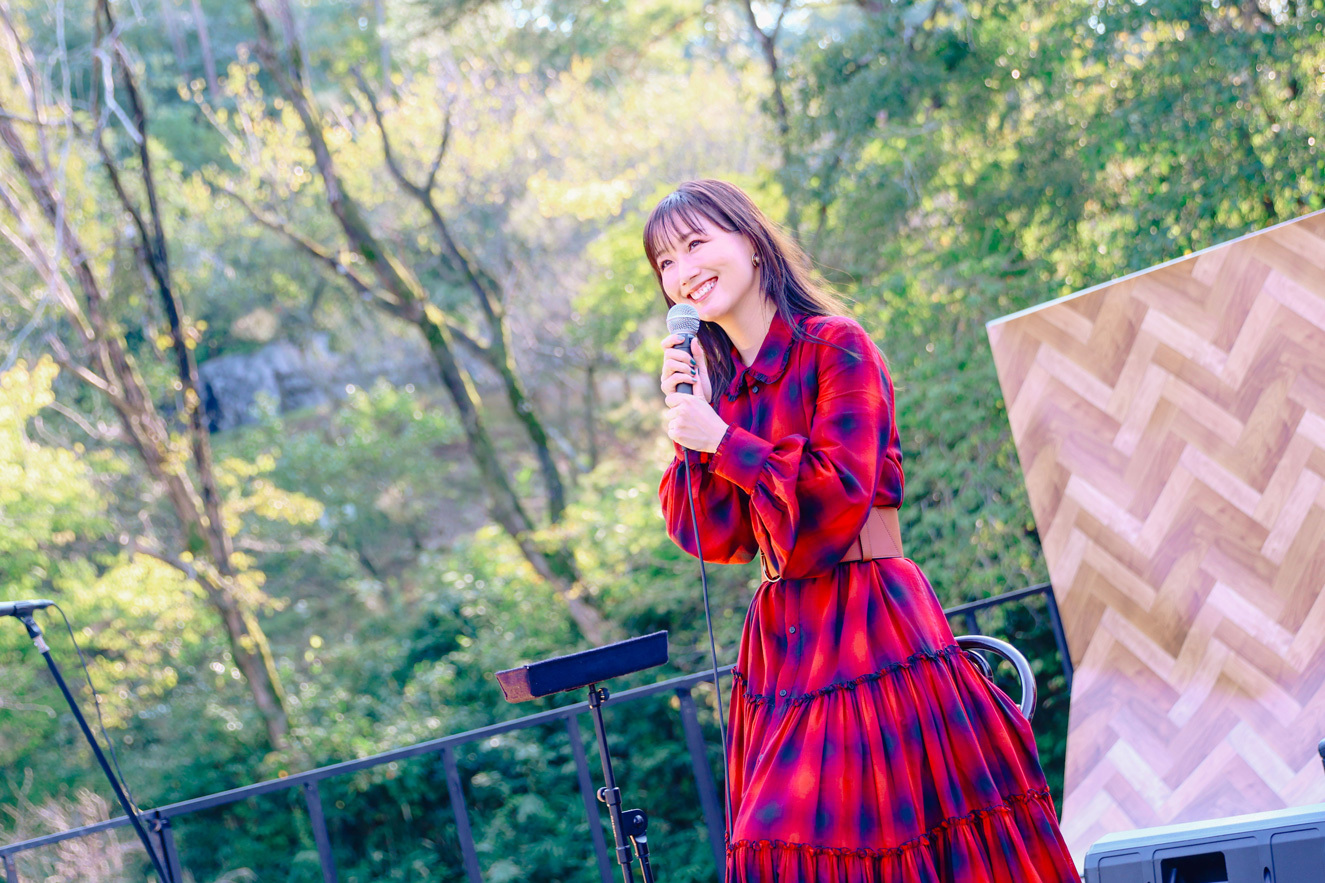 曲が終わると、「暑いね、大丈夫?」とあまりの日差しの強さに観客を気遣う。「すごい秋晴れやね。眩しいね……あ、私がスターやから眩しいわけじゃないから、許して(笑)」と和ませつつ、「ユメクイ」「恋愛写真」と続き、「幸せになるヒントは、常に自分の中にある」というテーマが込められた「ドラセナ」をじっくりと聴かせる。青々とした空に、歌声が響き渡り、周囲の緑に住む虫や鳥の声、木々のざわめきと重なりながら共鳴するかのように広がってゆくメロディー。コンサートやライブハウスとは全く異なる、周りに緑しかない(それも単なる緑ではなく古墳群という)環境だからこその澄み渡った音と反響の美しさには、感動せずにいられなかった。