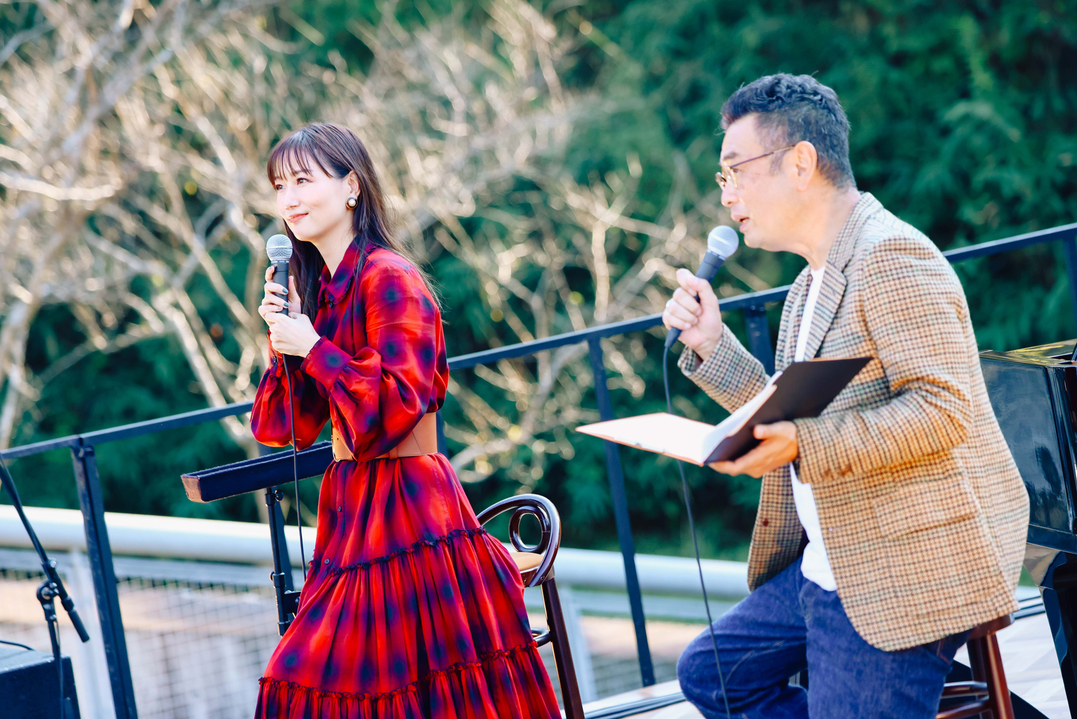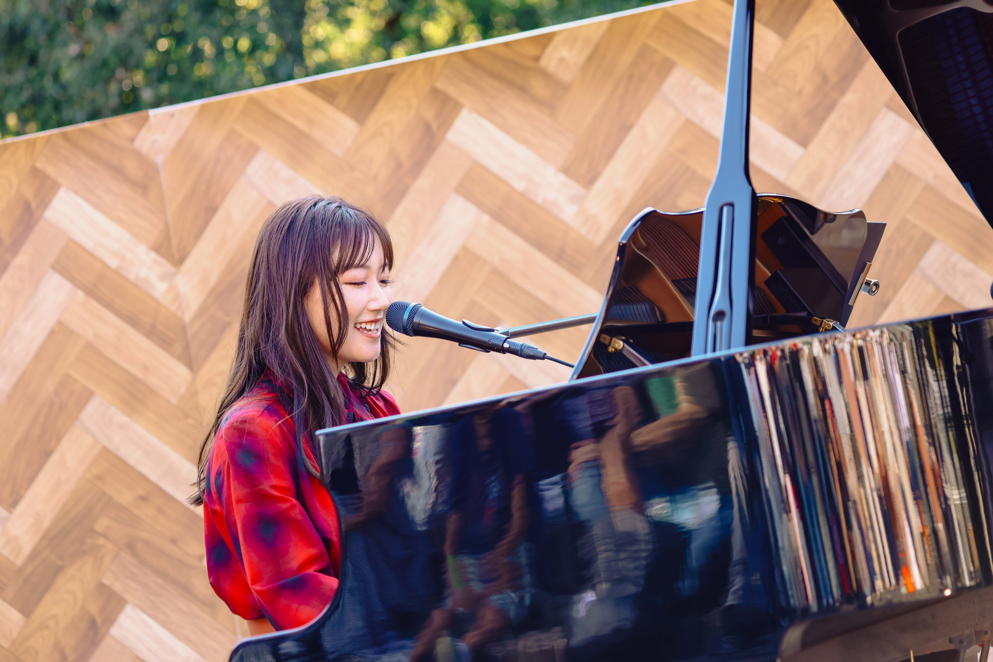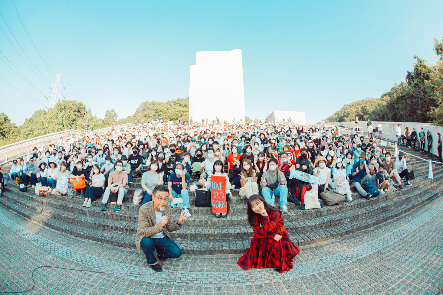 曲が終わると、「暑いね、大丈夫?」とあまりの日差しの強さに観客を気遣う。「すごい秋晴れやね。眩しいね……あ、私がスターやから眩しいわけじゃないから、許して(笑)」と和ませつつ、「ユメクイ」「恋愛写真」と続き、「幸せになるヒントは、常に自分の中にある」というテーマが込められた「ドラセナ」をじっくりと聴かせる。青々とした空に、歌声が響き渡り、周囲の緑に住む虫や鳥の声、木々のざわめきと重なりながら共鳴するかのように広がってゆくメロディー。コンサートやライブハウスとは全く異なる、周りに緑しかない(それも単なる緑ではなく古墳群という)環境だからこその澄み渡った音と反響の美しさには、感動せずにいられなかった。