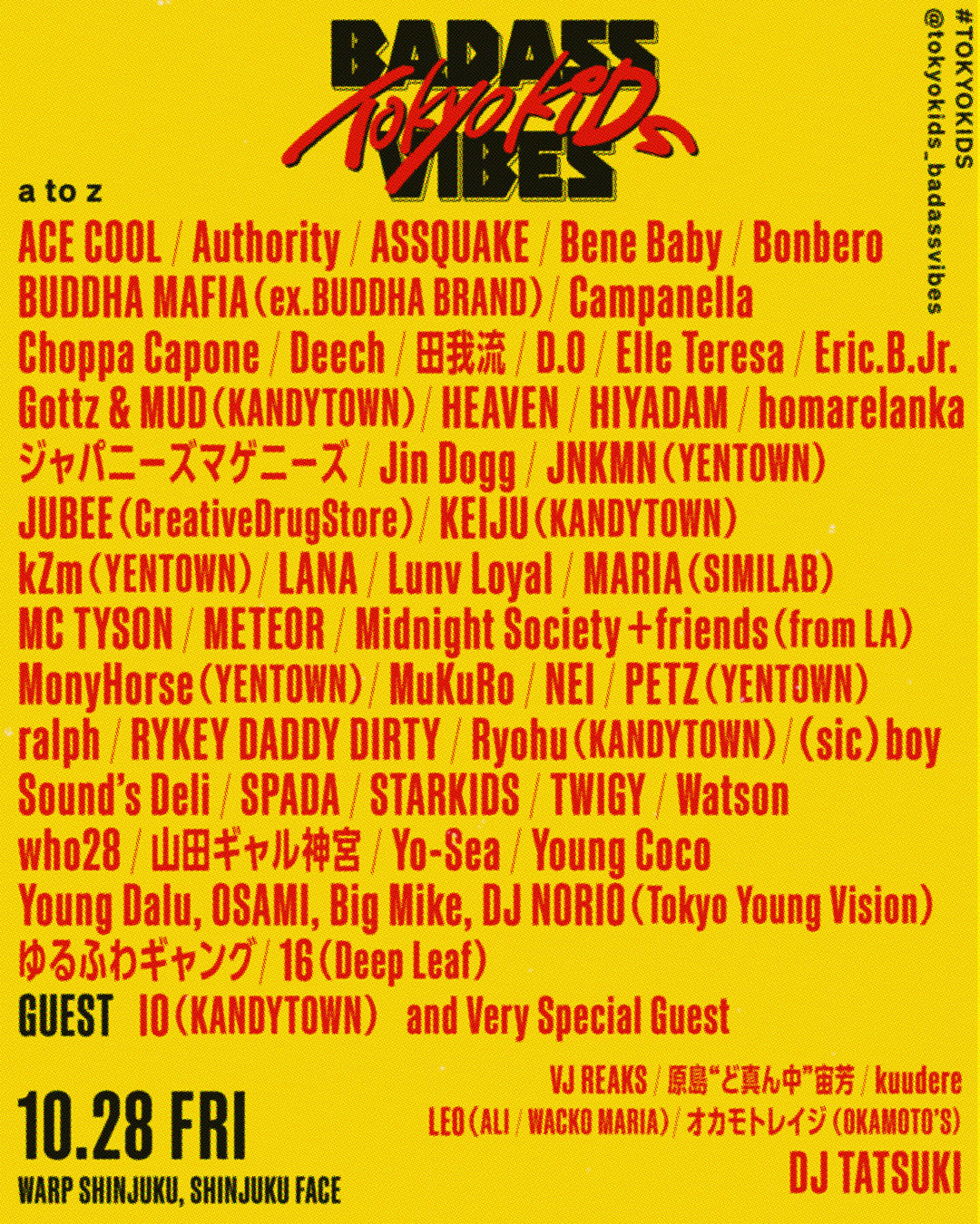 10月28日(金)に新宿・WARP SHINJUKUとFACEの2会場、スリーエリアで開催される最大級ヒップホップサーキットフェス『BADASSVIBES presents TOKYO KIDS』追加出演アーティストが発表となった。