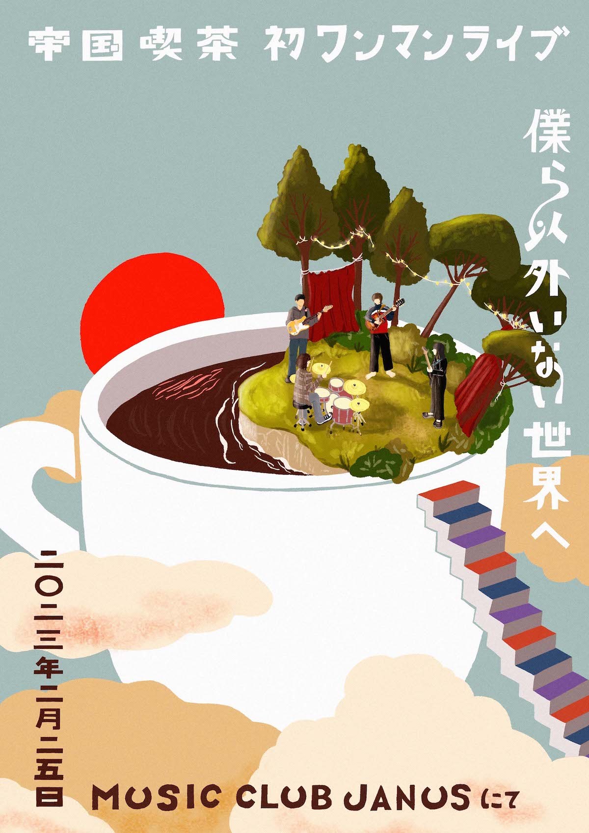 2023年2月25日(土)、場所はライブを始める様になってからホームとして大切にしている心斎橋Music Club JANUS。ライブタイトルは『僕ら以外いない世界へ』で、自分たちの楽曲「貴方日和」の「僕ら以外いない世界で 共に生きよう」という歌詞からインスパイアされている。帝国喫茶と帝国喫茶だけを観に来るお客さん、<僕ら以外いない世界へ行く>というシンプルな気概が込められているという。