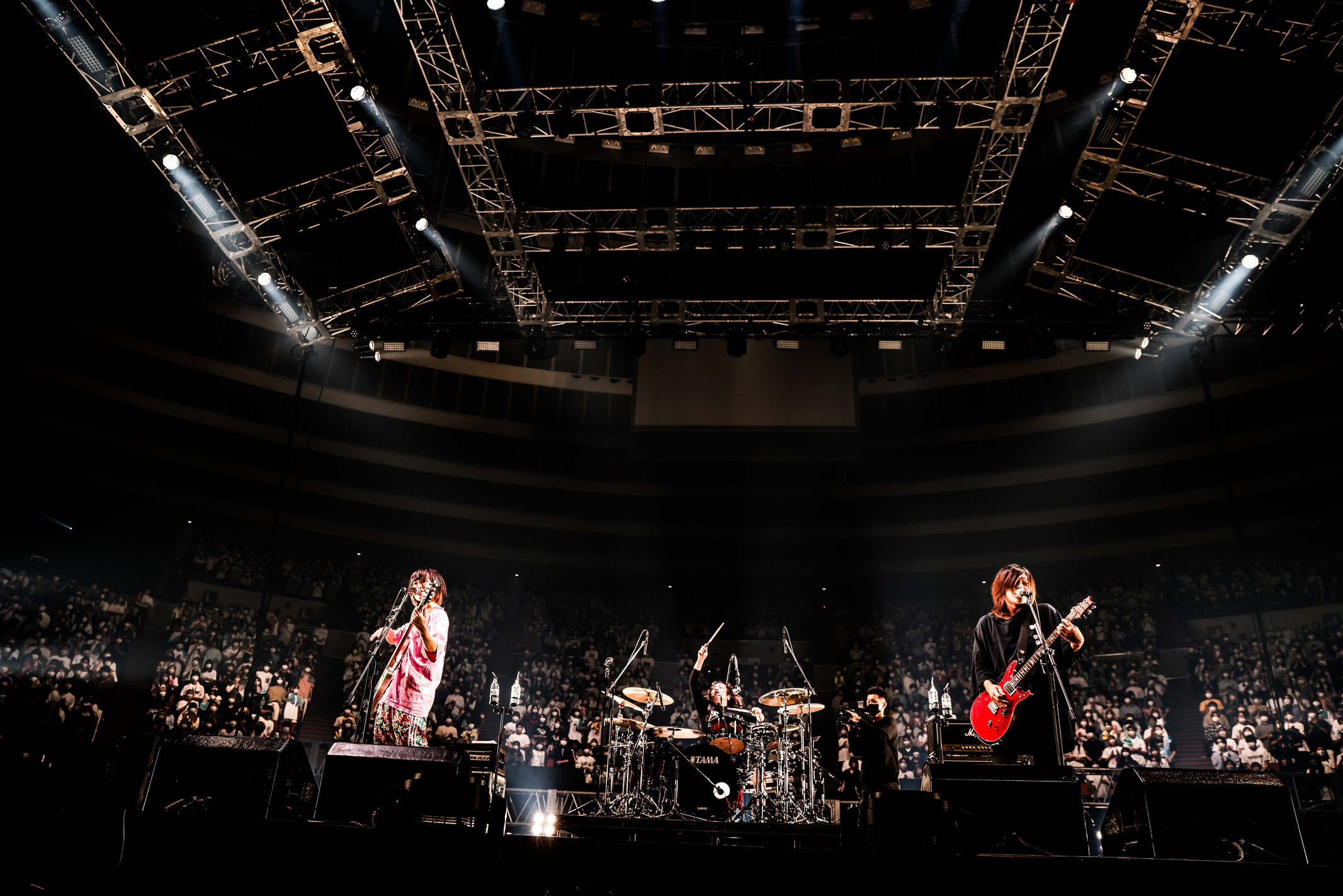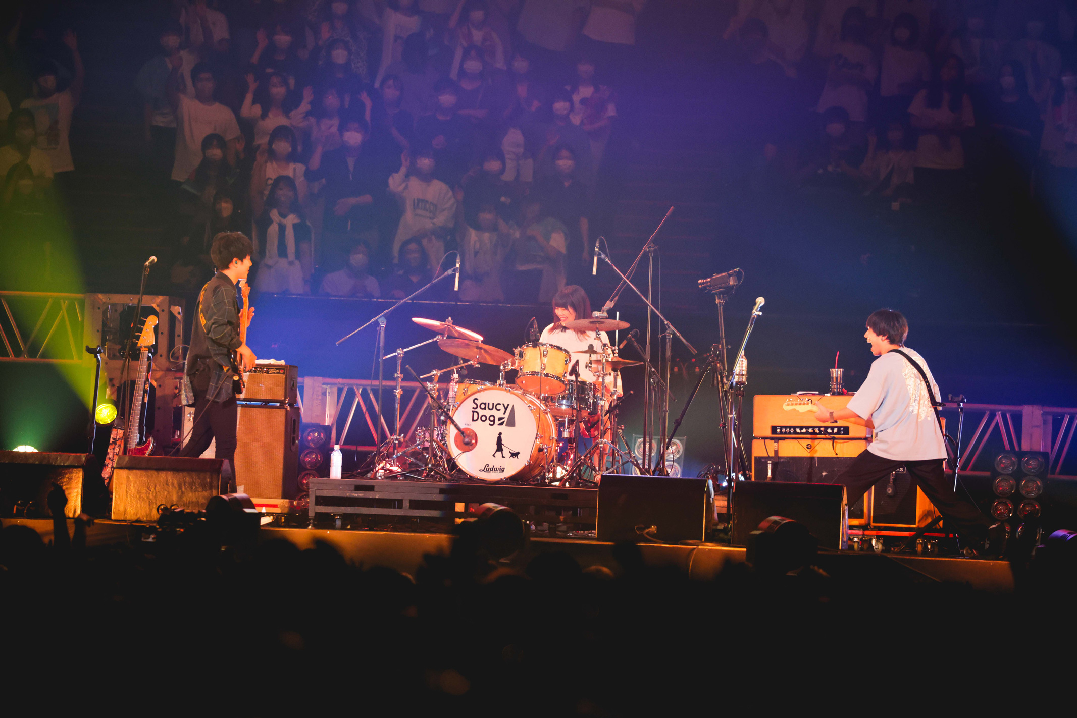 石原慎也(Vo.Gt)、せとゆいか(Dr)、秋澤和貴(Ba)がひとりずつ登場し、3人がドラムの傍らに集まり拳を合わせるとSaucy Dogのステージがはじまる。「Be Yourself」のリリックビデオがライブ映像とともにモニターに映し出され、心の中で口ずさみながら歌詞の世界観に浸るオープニング。「Saucy Dogはじめます。よろしくです」と石原が声をかければ、どんな大きな会場でも、いつもと変わらない彼らの空気感がそこに生まれる。